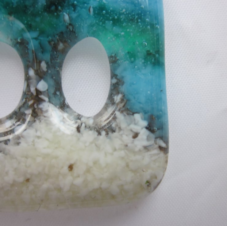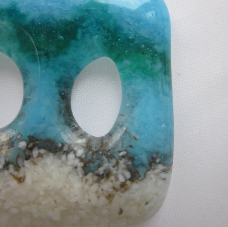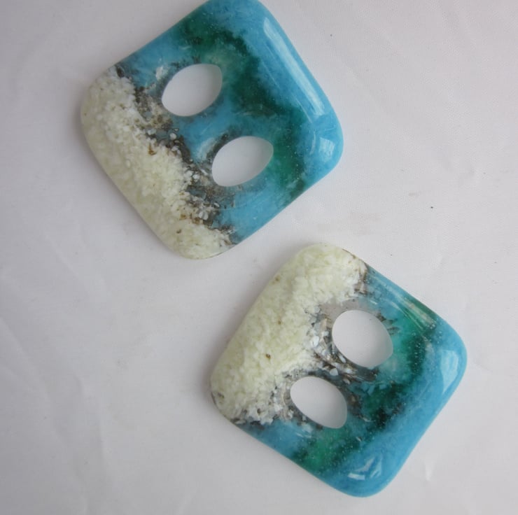 Each button is handmade and there will be some irregularities in shape due to this - do not expect perfectly matched holes! Frit casting is done by combining tiny pieces of glass, including clear, within a casting mould. This means that there may be variations of colour depth within the piece and this is normal.