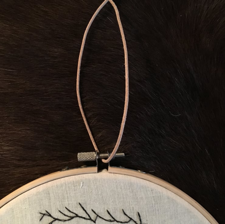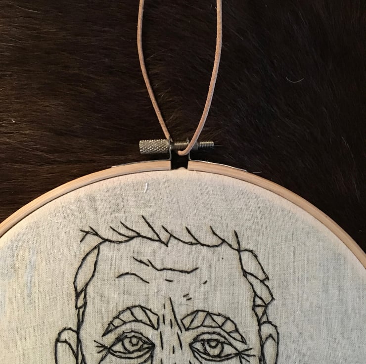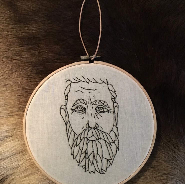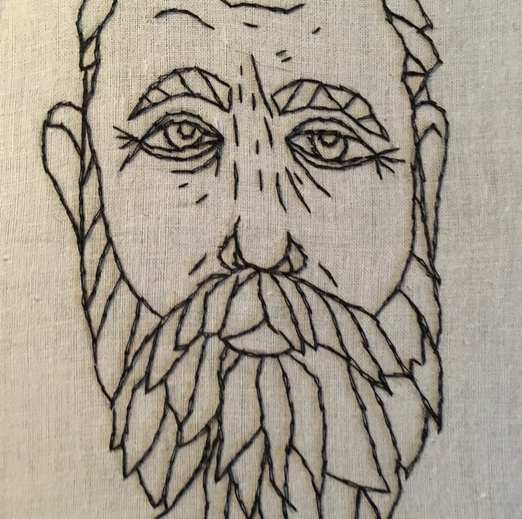 A hand embroidered image of an older bearded beauty, using calico and black cotton based thread on a 19cm (approx) diameter wooden embroidery hoop.