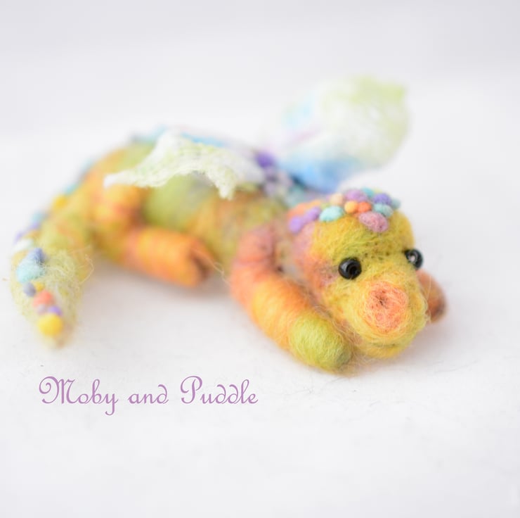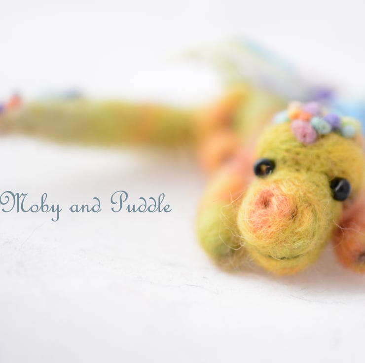 Neep is a little dragon that sits neatly inside an adults palm, he is needle felted and not CE tested so although he does like children and would never breathe fire at them, he should be put well out of their reach, just in case! He also gets a bit shy of bearded men but can be pursuaded to play if they feed him a little tikka balti.