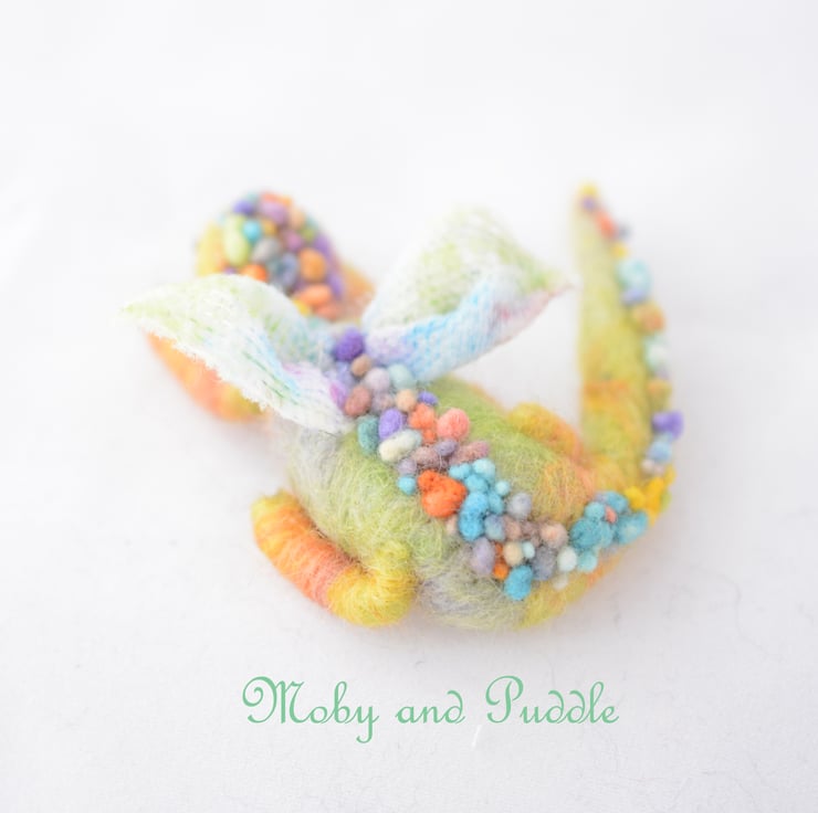 He has hand painted wings that are felted onto his body! He only flies when he is not being watched though unfortunatley. He does like to doze and spends a lot of time sleeping so he makes an ideal pet.