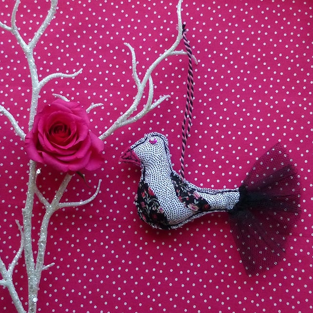 A black flirty net tail, hot pink sequin and white seed bead eyes, and a hot pink felt beak finish her look.