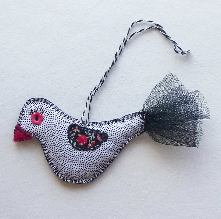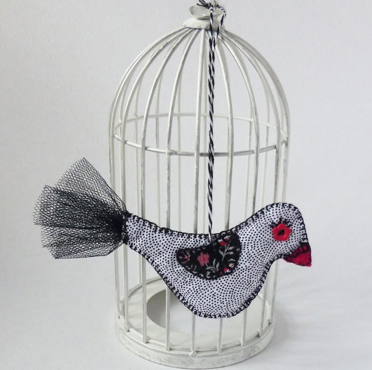 She is hand sewn in a black and white cotton dotty fabric, and has pink flower button eyes, a stylish net tail, a bright pink felt beak, and wings made from an upcycled flower fabric.