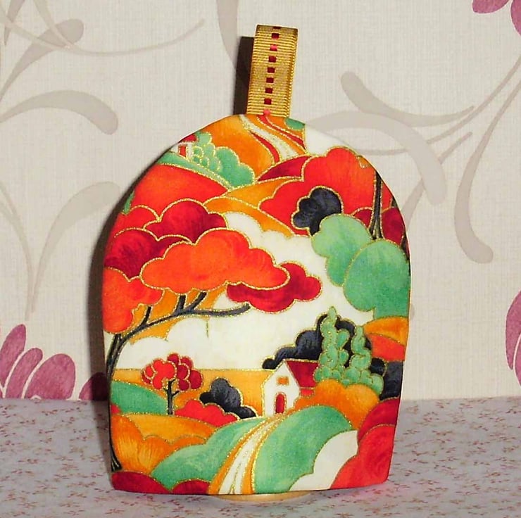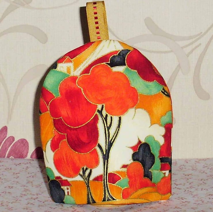 This is a very pretty egg cosy in Clarice Cliff style fabric it measures approx. 5.5 inches high x 4.5 inches wide and is made from a cotton fabric, with a spotty lining and a layer of wadding for egg cosiness. There is a ribbon on top for decoration and easy removal of the cosy.