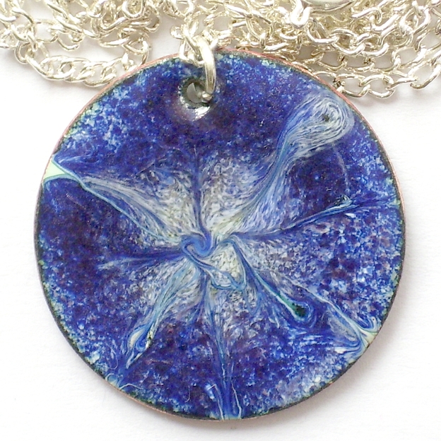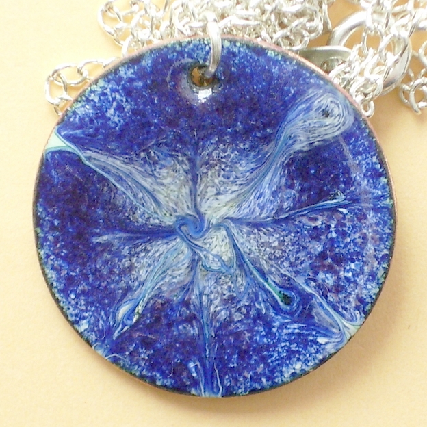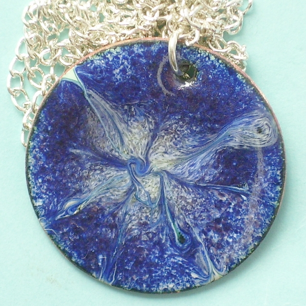 I have made this pendant by layering dark blue enamel over white then drawing in a scrolled design of white in the blue coat.