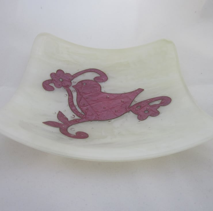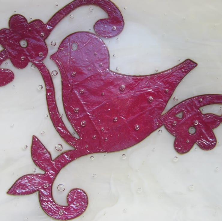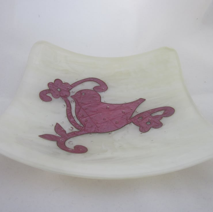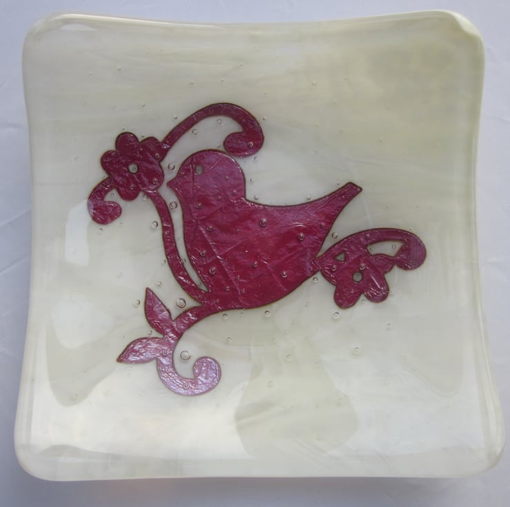 This bowl has a copper bird on a delicate vanilla cloud glass and is approximately 5 1/2 inches across. The heat has turned the copper a lovely dark matt red and blue and the colour in the copper is amazing. This bowl is very pretty! It has been fully annealed to make it strong. This would make a great gift or treat.
