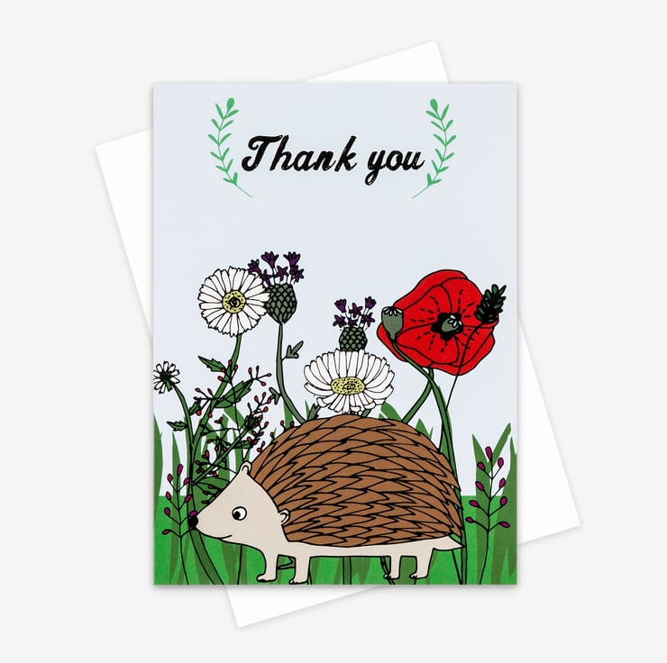 Originally drawn by hand, this illustration is of a hedgehog in a garden of wild flowers.