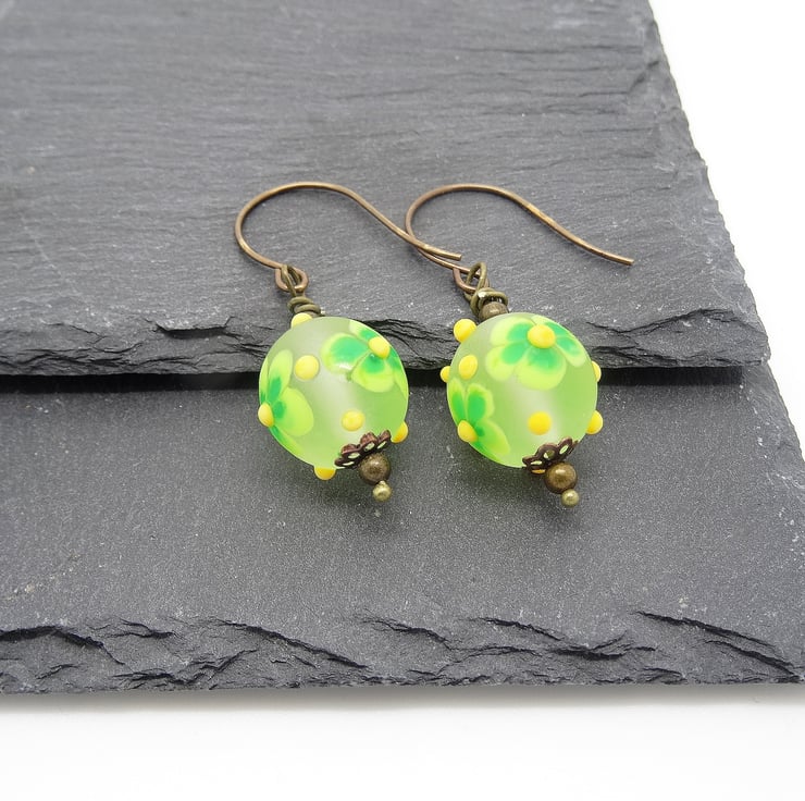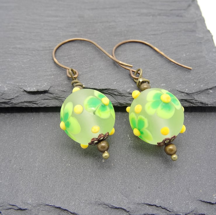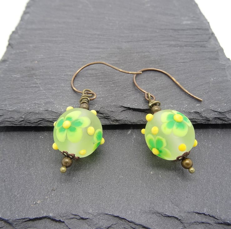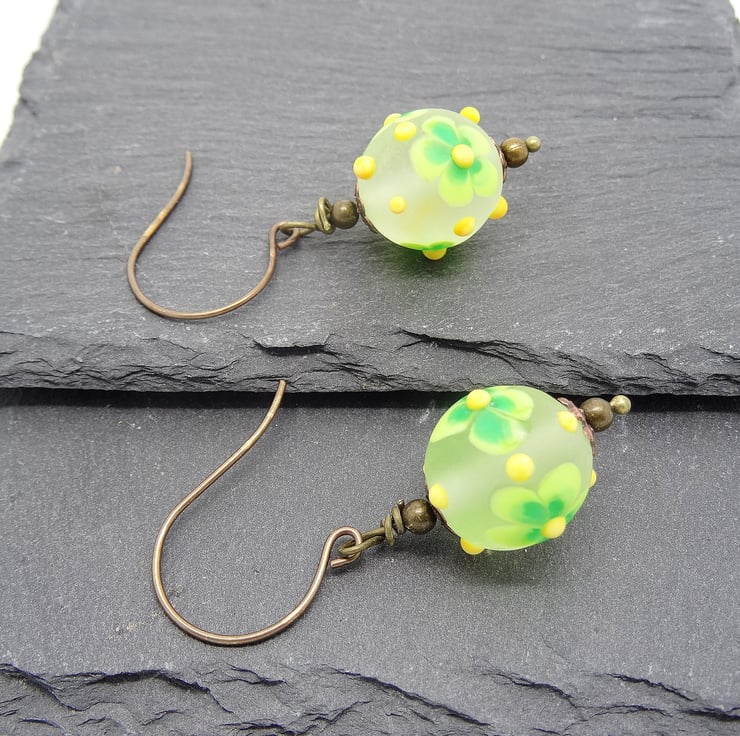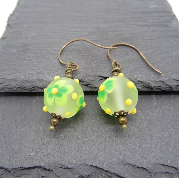 These are lovely earrings made with 16mm handmade lampwork beads in a lemon and lime colour and decorated with delicate flowers and raised dots. These were made by Lampwork Glass Artist (Midget Gem Beads). The wire,filigree bead caps and small round beads I have used are all antique brass colour. The earrings measure just over 1.1/2" (4cm) from top of vintaj brass, nickel free earwires. As all of the items in my shop are unique, individual pieces made by myself, these are the earrings you will receive.They will arrive gift wrapped in tissue paper and a organza bag.