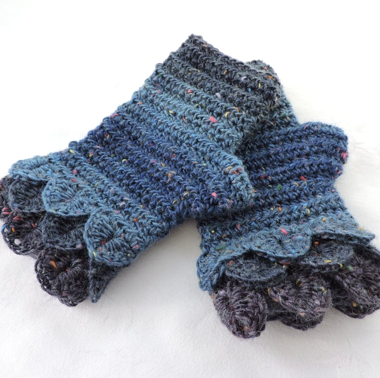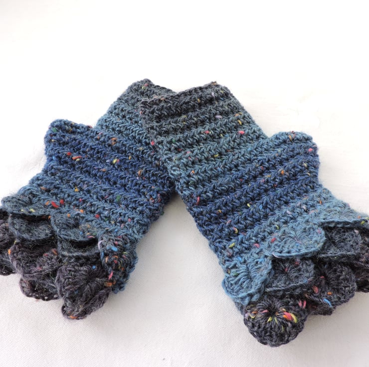 Graduated tonal colour of blue with coloured flecks throughout giving a tweed effect. Crocodile stitch cuffs and a plain body.