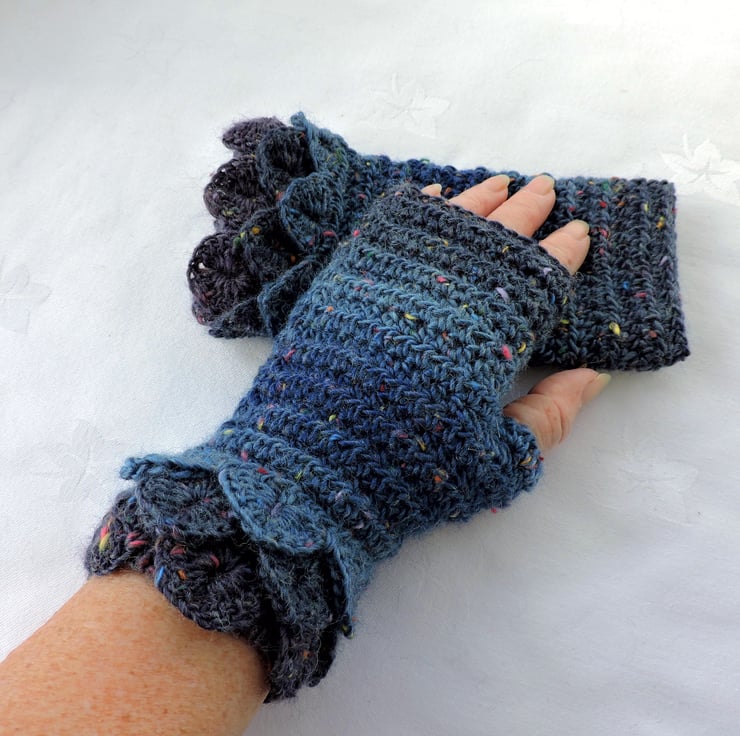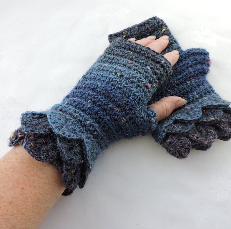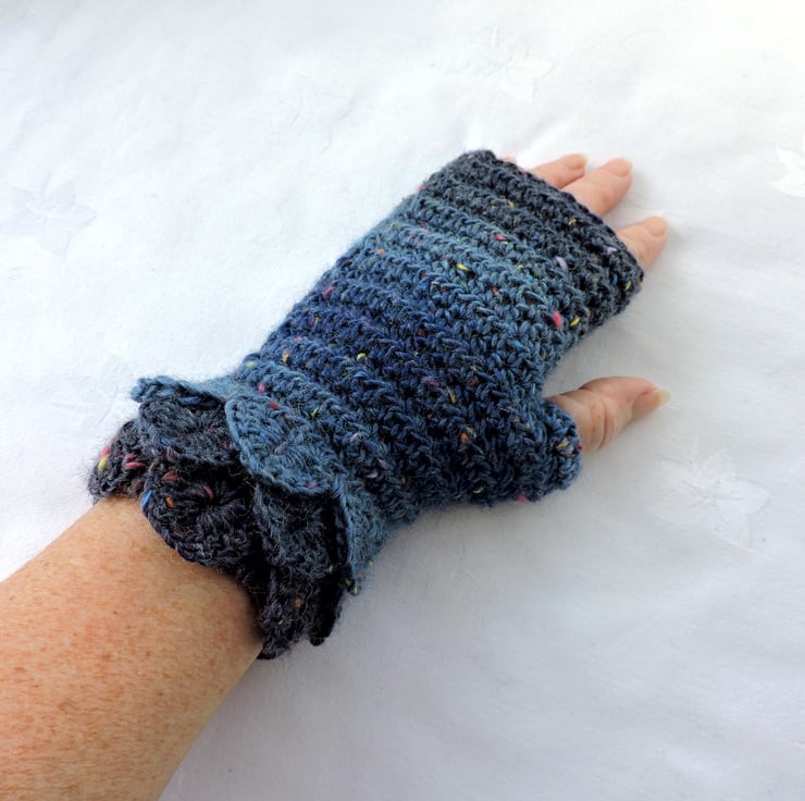 These fingerless mitts cum wrist warmers are crocheted in a lovely soft and warm acrylic and wool yarn.