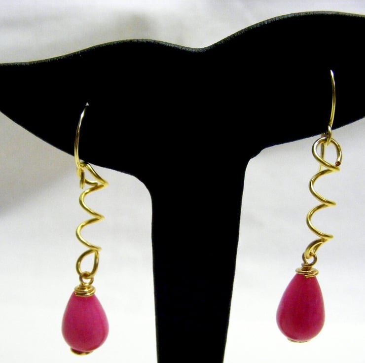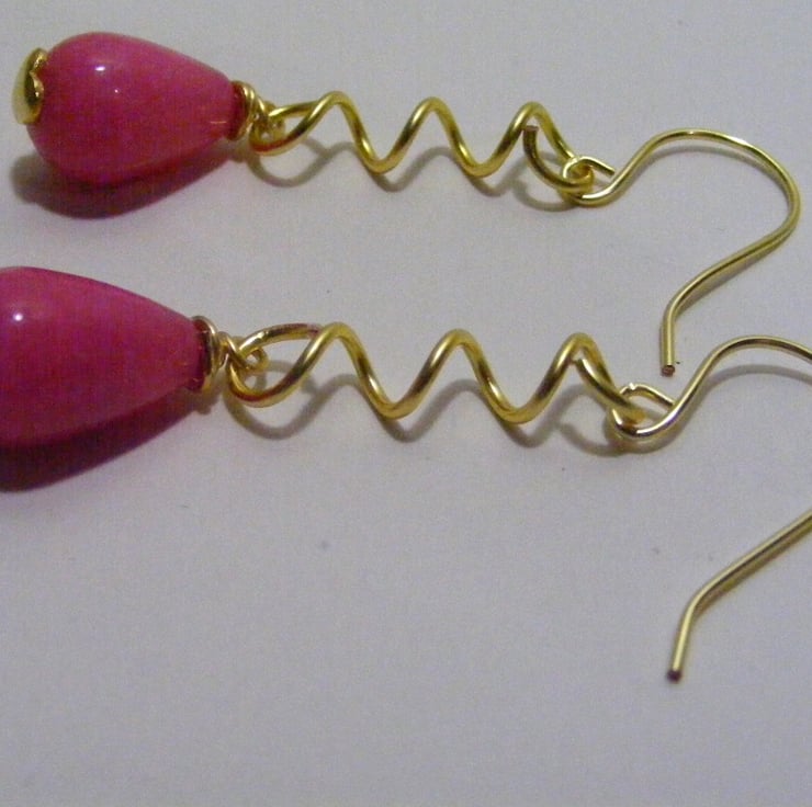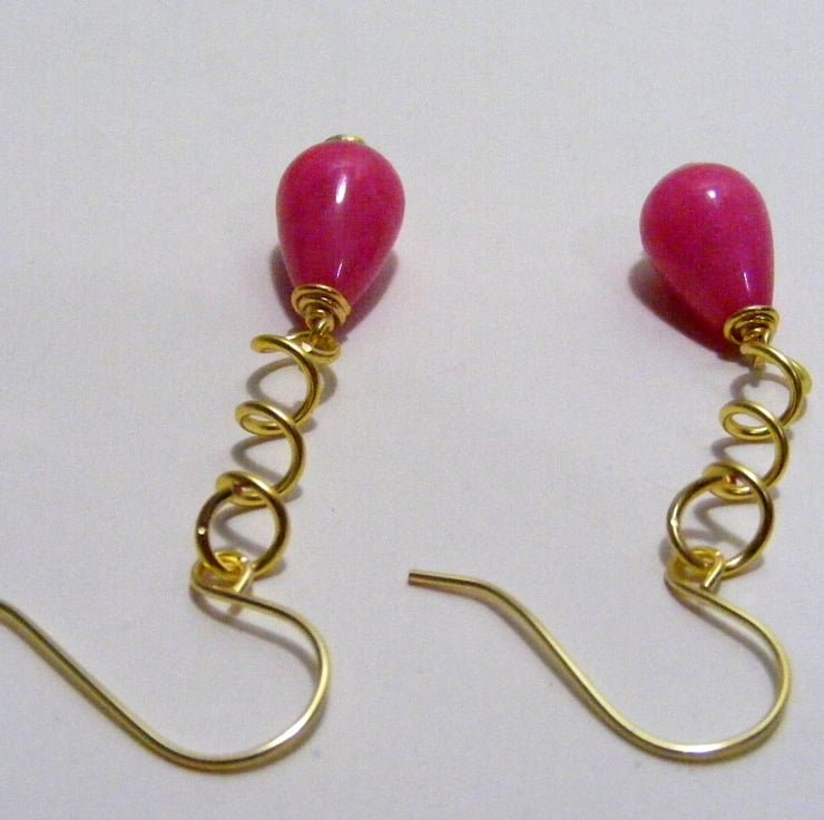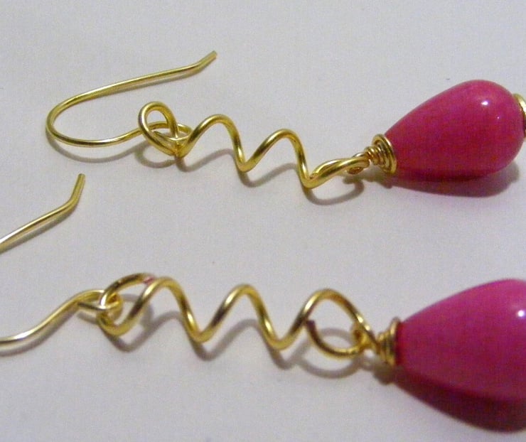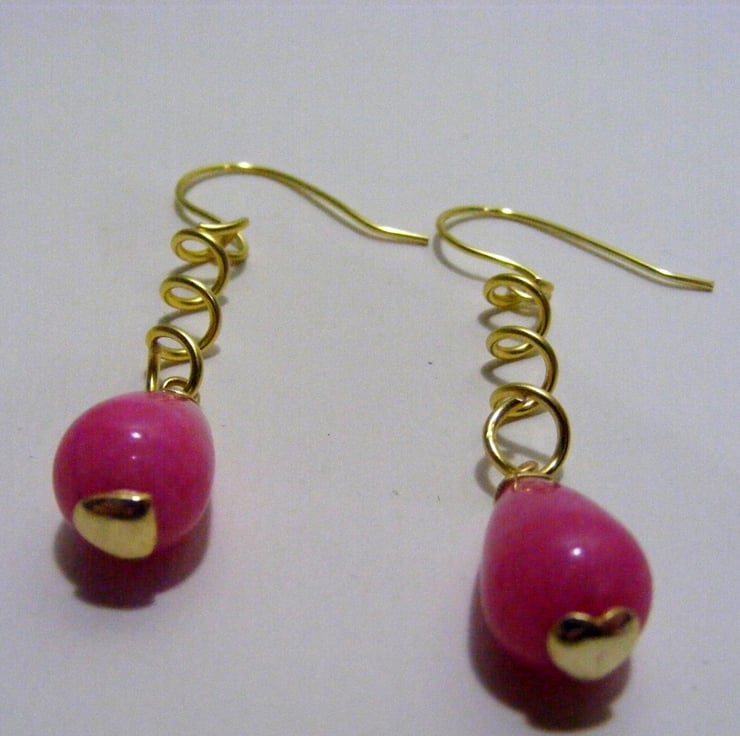 I have made these semi precious gemstone earrings by threading 14 x 10 mm pink quartzite drops onto gold colour copper heart ended headpins and wrapping the remaining wire.
