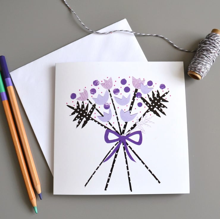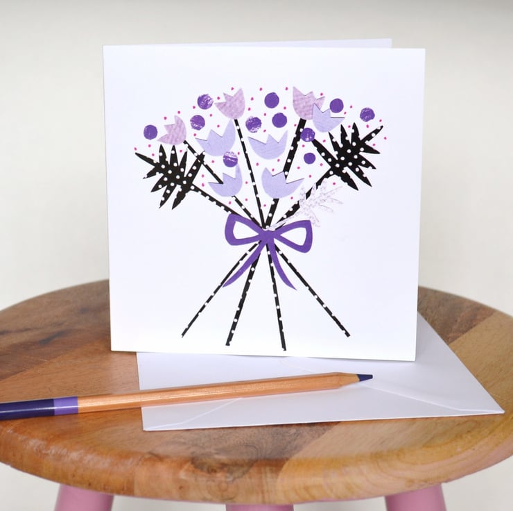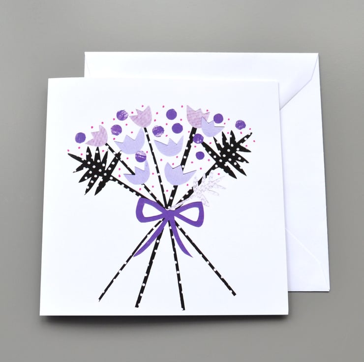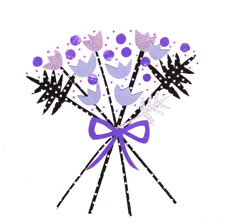 Card showing a striking bouquet in shades of grey, purple and black, tied with a purple bow. This would be a great all-round card to have in your card drawer, good for birthdays, general greetings, mother's day and even as a sympathy card. The bouquet was hand cut from painted and patterned papers with some pink dots added by hand. This design was then digitally reproduced.