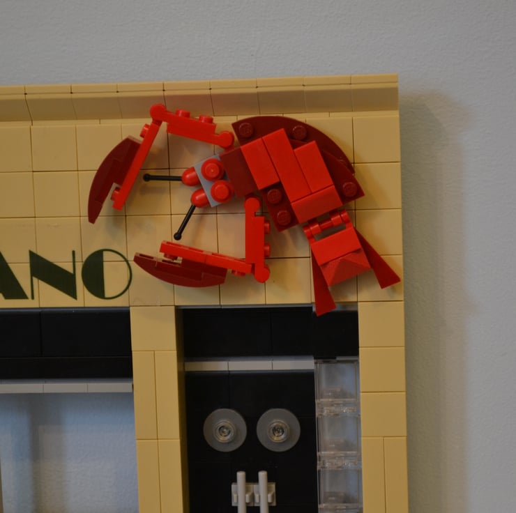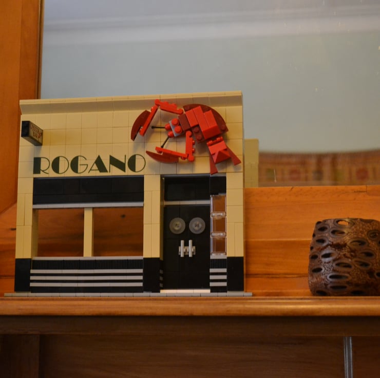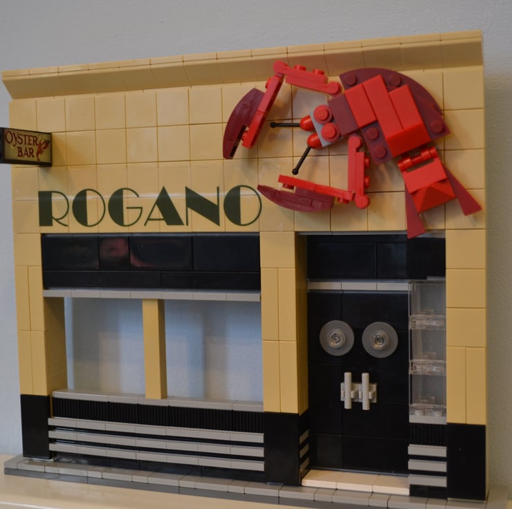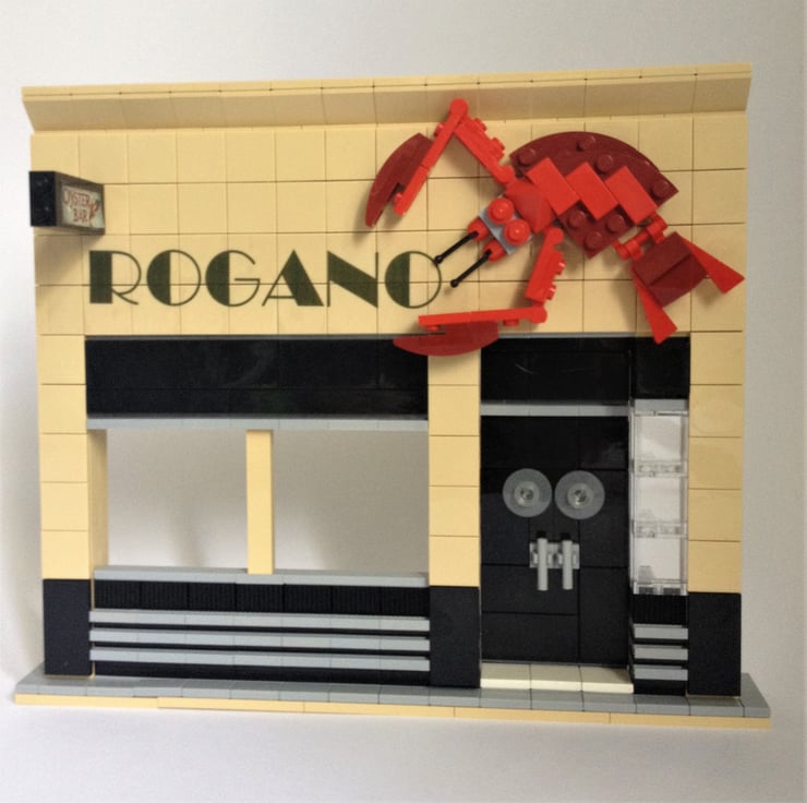 I've created a stylish lego model of Glasgow's famous Rogano restaurant frontage. Opened in 1935, its beautiful Art Deco features were modelled on those of the Queen Mary liner which was being built in Glasgow at the same time. While my model is largely faithful to the original, I've used Lego to bring the lobster on the sign to life a little.