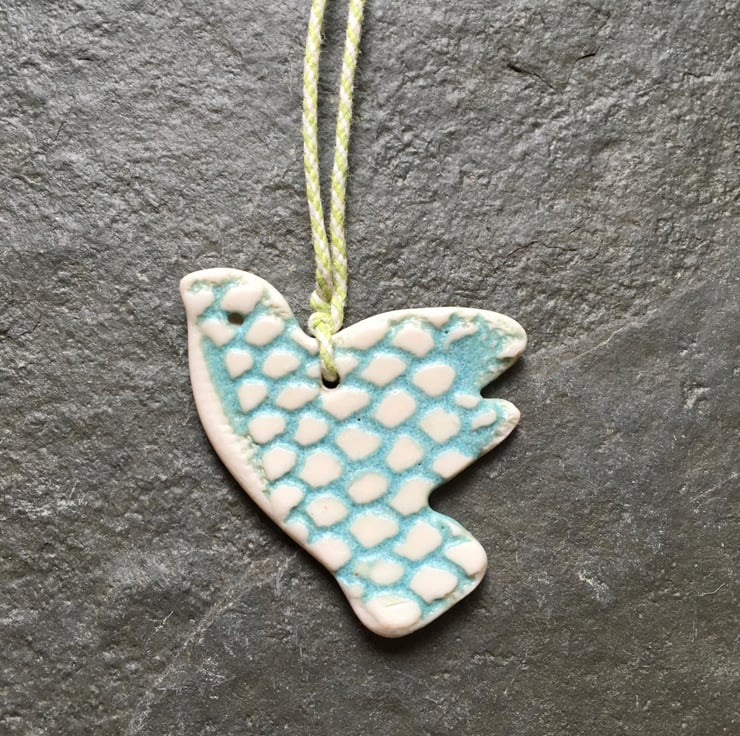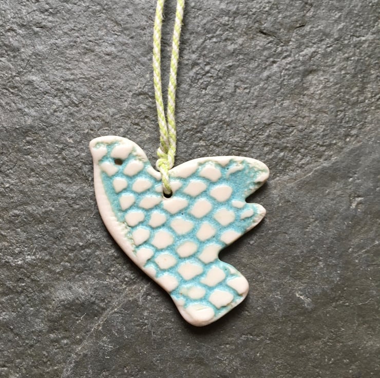 A dainty white and aquamarine glazed porcelain dove, ready to hang on pale green cord.