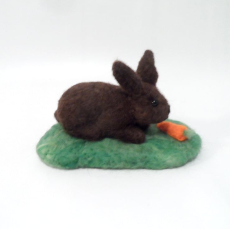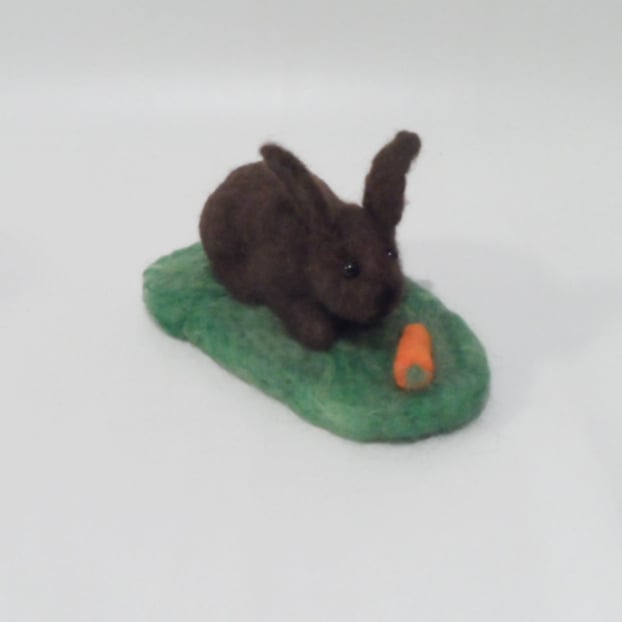 This sweet little bunny rabbit has been needle felted in natural brown merino wool over a core wool base and has had black glass eyes inserted. Mounted on a green "grassy" base complete with a tasty carrot, this rabbit represents many hours of needling to create a solid, sculptured object. The base measures approximately 9cm x 15cm (3.5" x 6") and the ornament is 9cm (3.5") high at the highest point.