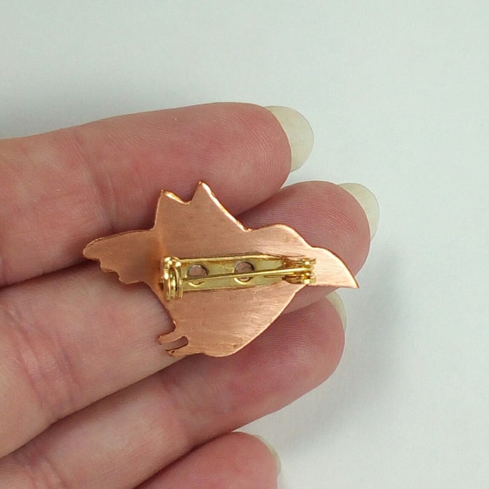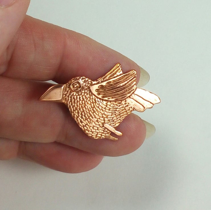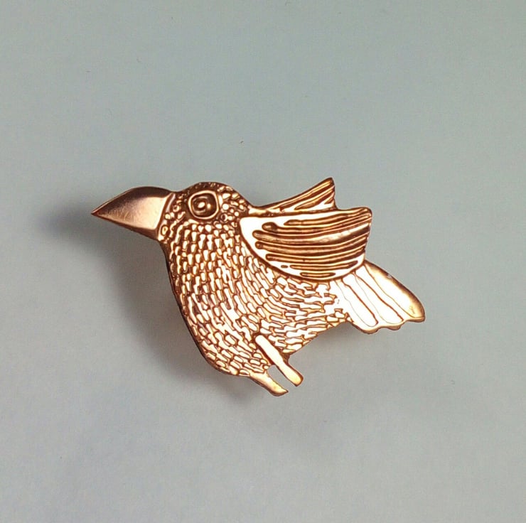 Small flying finch, etched with a hand drawn pattern to different depths.