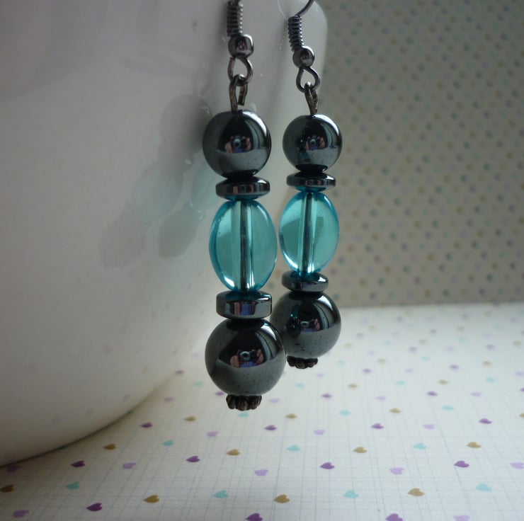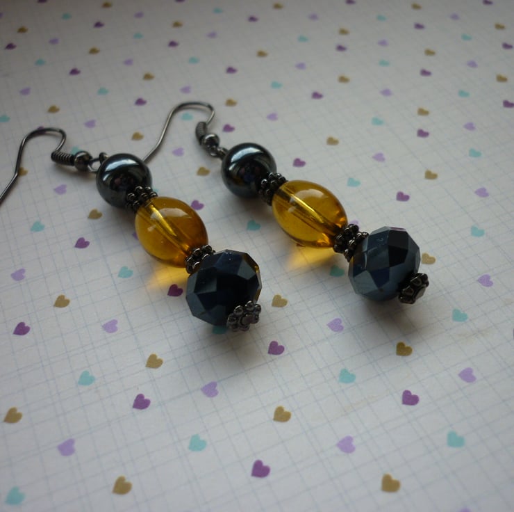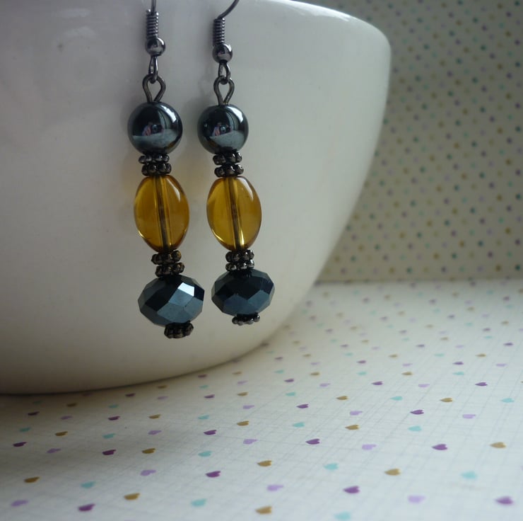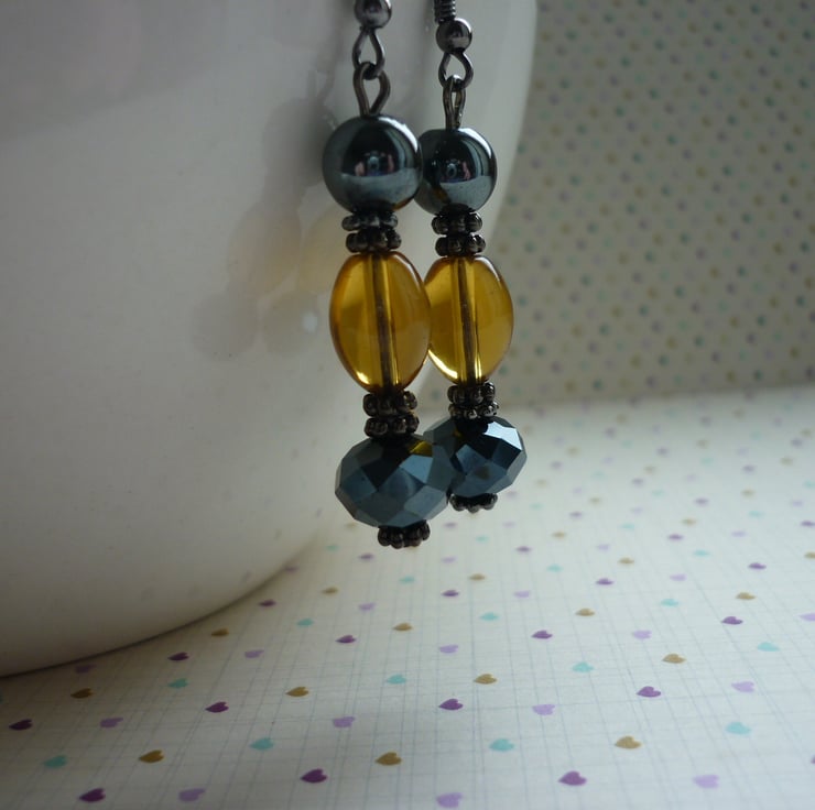 THE EARRINGS HAVE BEEN MADE USING FACETED GLASS RONDELLE BEADS IN HEMATITE, ROUND HEMATITE STONE BEADS, OVAL CLEAR GLASS BEADS IN GOLDEN YELLOW ALONG WITH GUNMETAL COLOURED DAISY SPACER BEADS AND FINISHED WITH GUNMETAL NICKEL FREE EAR WIRES.