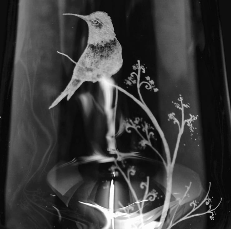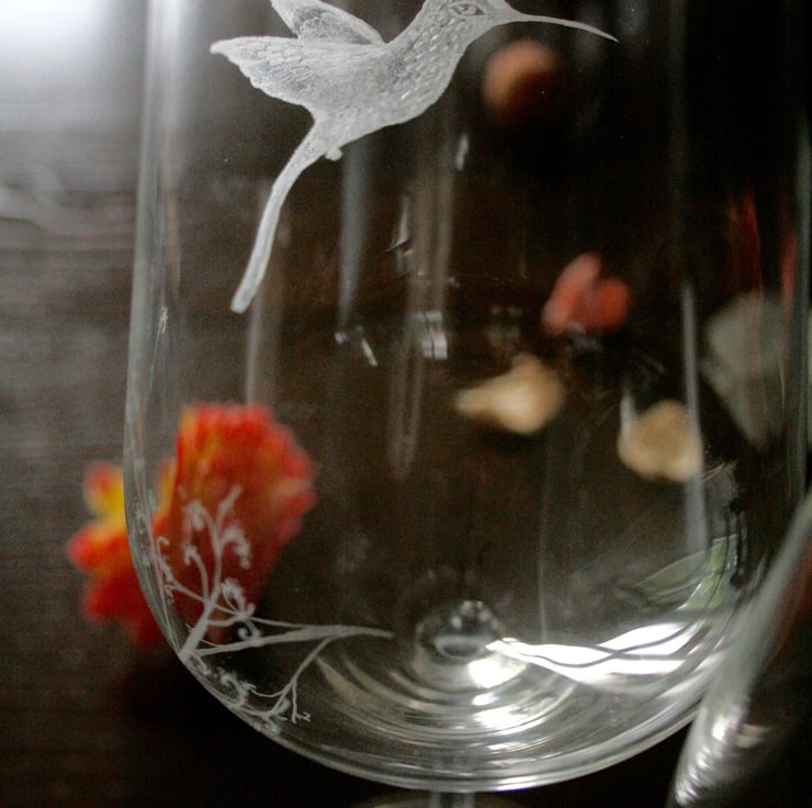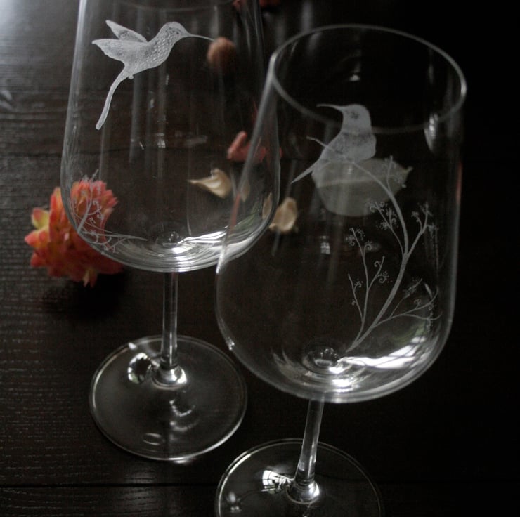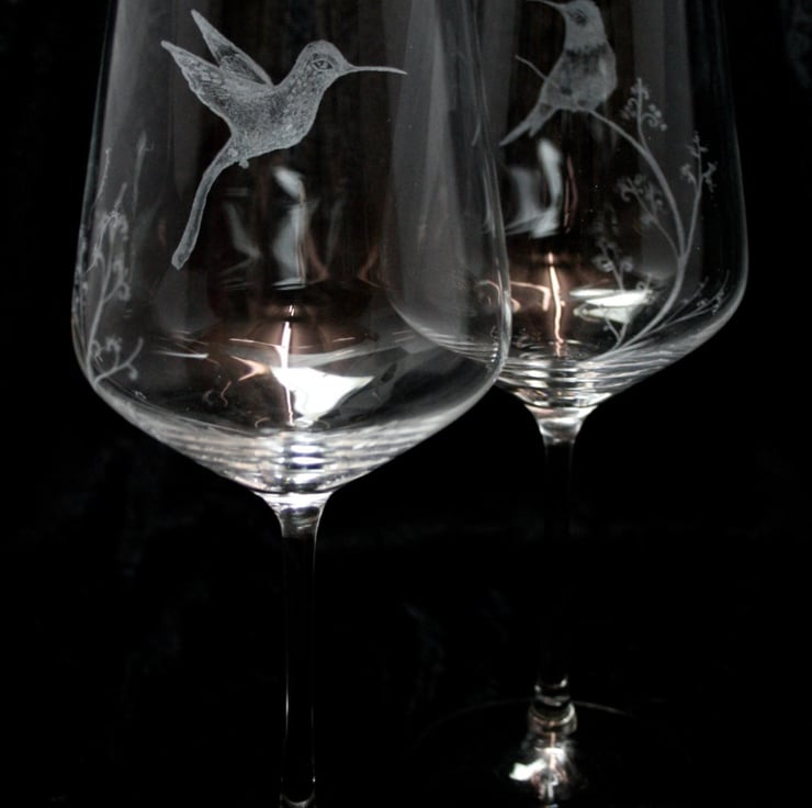 Bohemia crystal wine glasses, hand engraved hummingbirds.