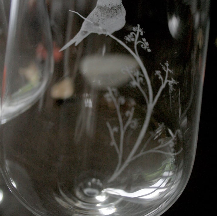 Each glass is engraved by hand, using a mix of stone, metal and abrasive burs. The machine I use is specifically for glass, and just touches the surface; it is a bit like drawing or tattooing.