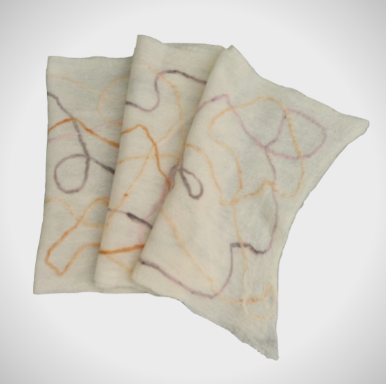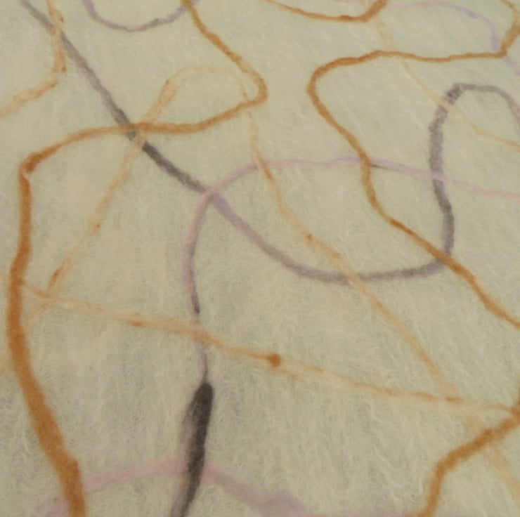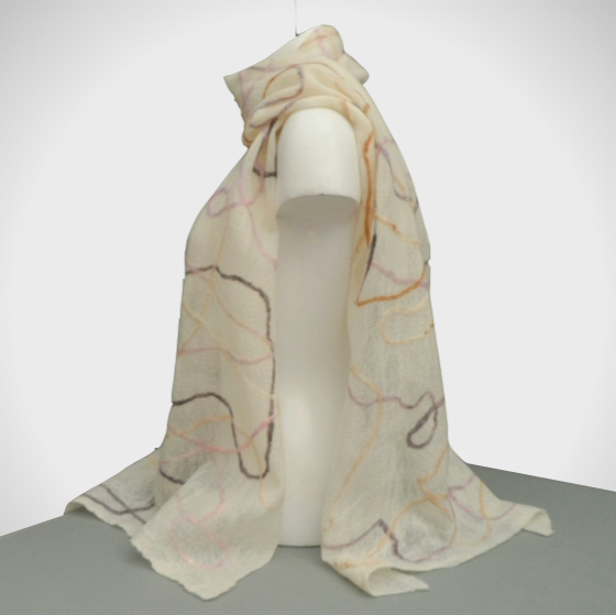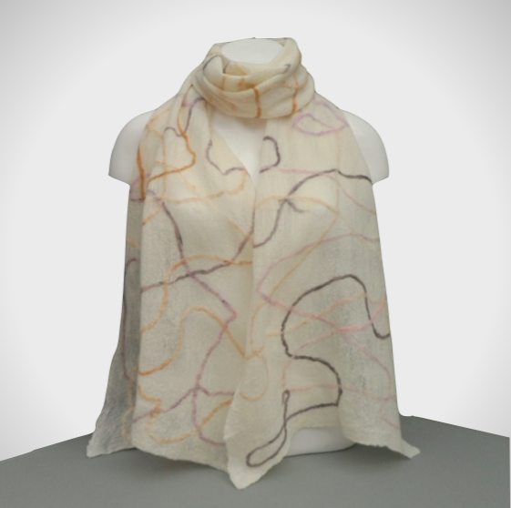 A beautifully soft and unique scarf. Made from very fine layers of natural white (unbleached) merino wool fibres nuno felted to both sides of a cream coloured silk chiffon fabric, this scarf has had a "scribble" pattern added to it using pencil roving (drafted but unspun wool) in shades of cream, beige, lilac and purple.