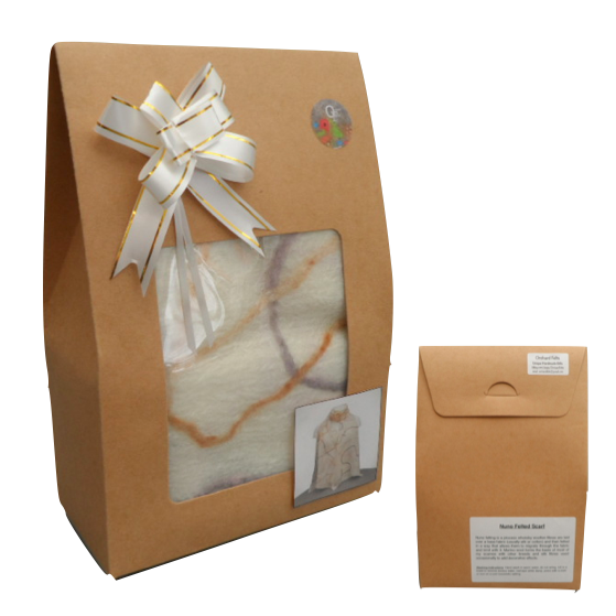 The nuno felting process allows the woollen fibres to migrate through the silk and bind with it. The resulting scarf is extremely lightweight, soft and drapes beautifully.