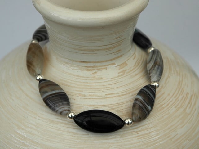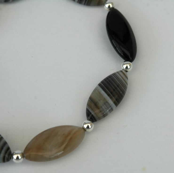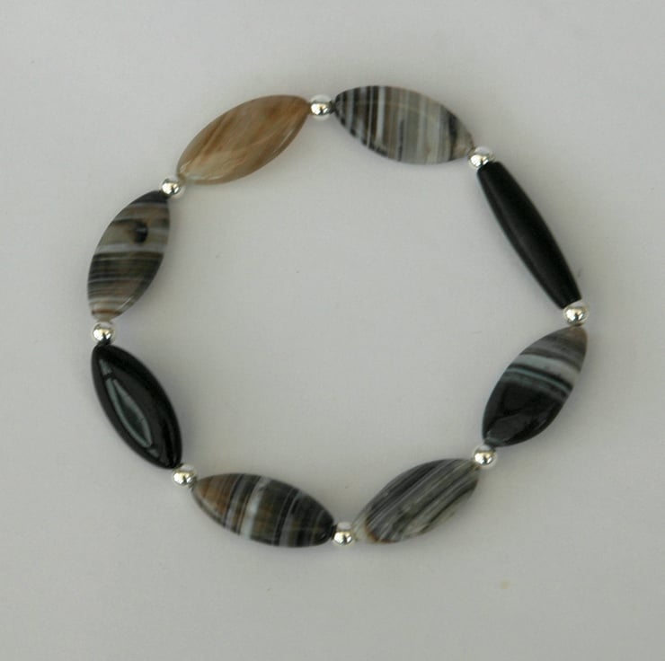 This sophisticated bracelet is perfect for everyday or evening wear. I have used marquise shaped beads of Botswana Agate and a single bead of black mahogany, alternating with 4mm round beads of sterling silver. The colours are black, white, brown and beige, with dramatic zebra stripes in the agate.