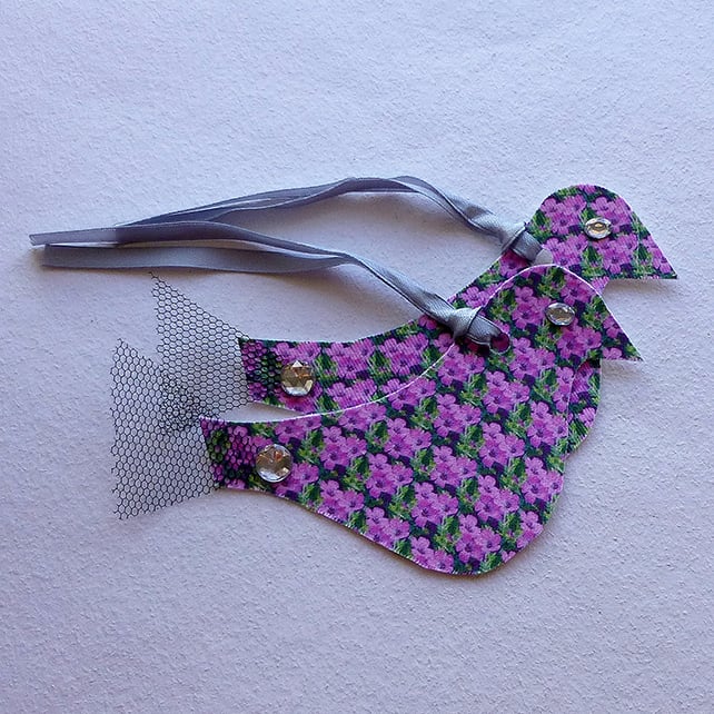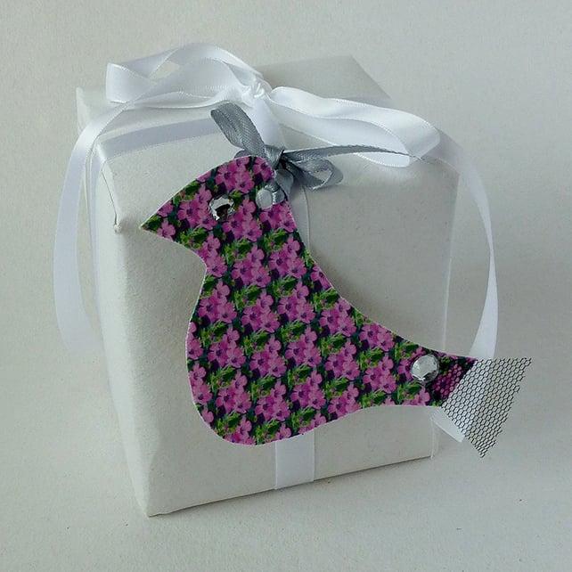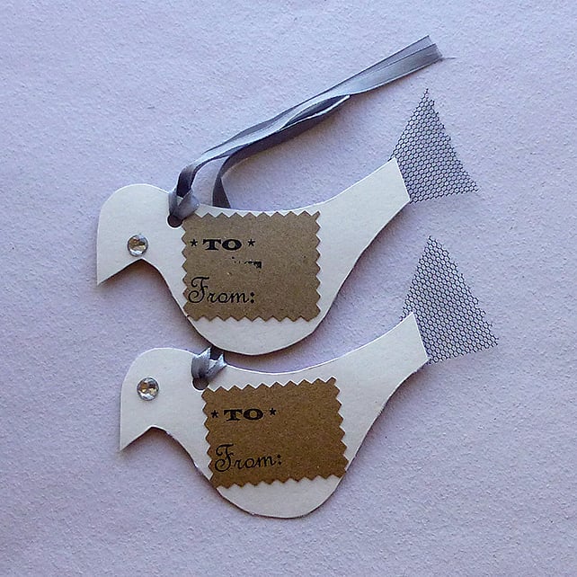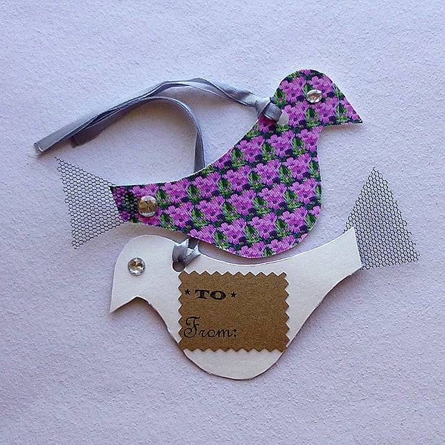 They have a little bling about them, with their silver stick-on gem eyes, and a silver stick- on gem highlighting their black net tails. Cotton fabric, which has been designed and printed in my home studio and then mounted onto hammer embossed ivory card, has been used in the crafting of these bird tags.