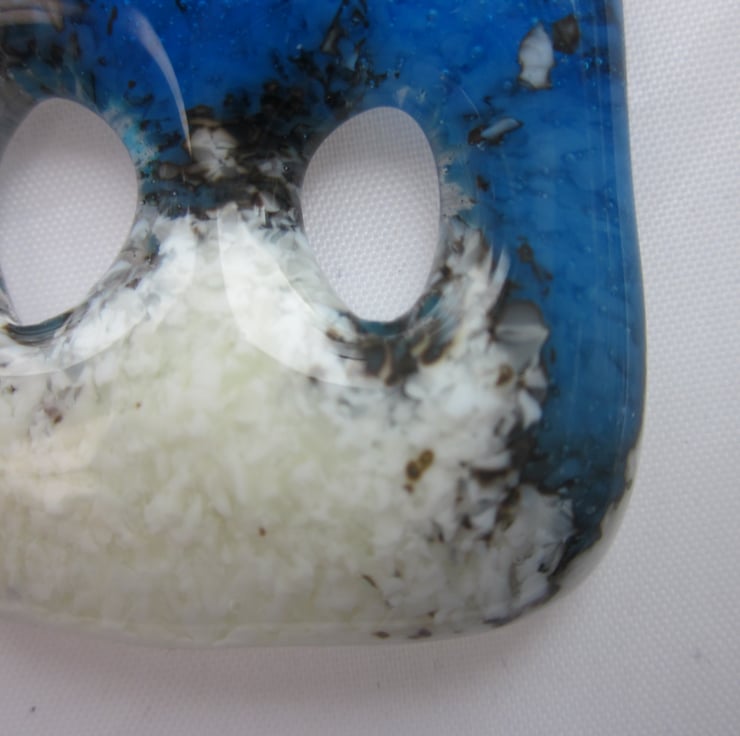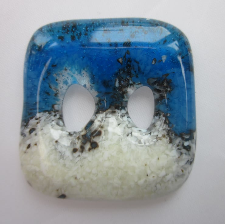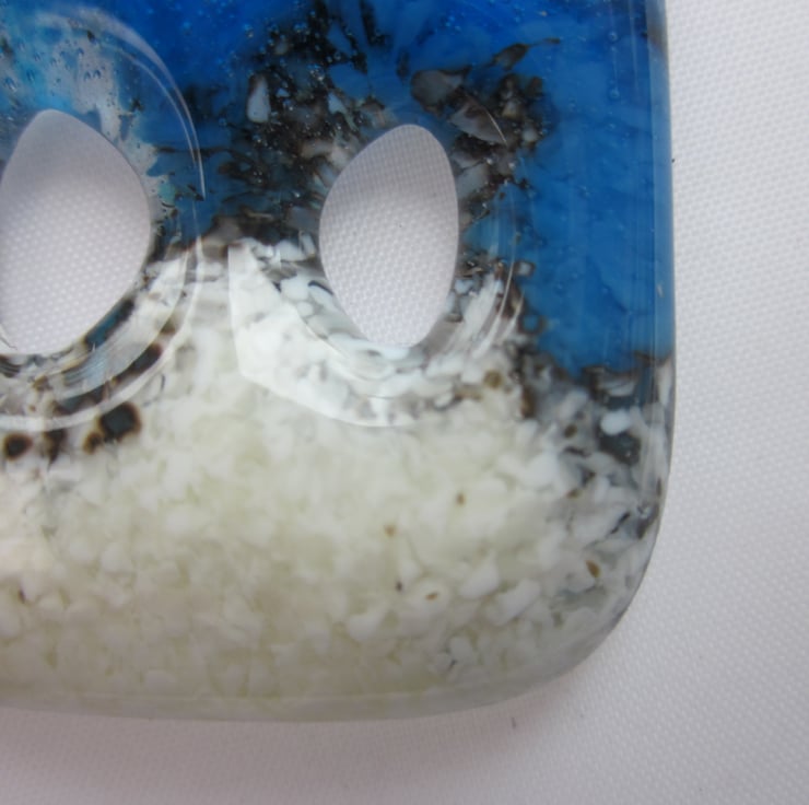 Each button is handmade and there will be some irregularities in shape due to this - do not expect perfectly matched holes! Frit casting is done by combining tiny pieces of glass, including clear, within a casting mould. This means that there may be variations of colour depth within the piece and this is normal.
