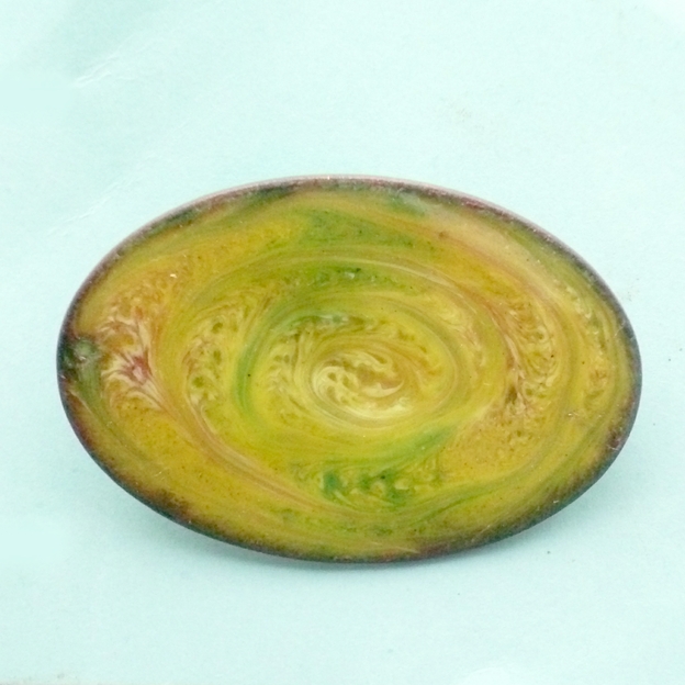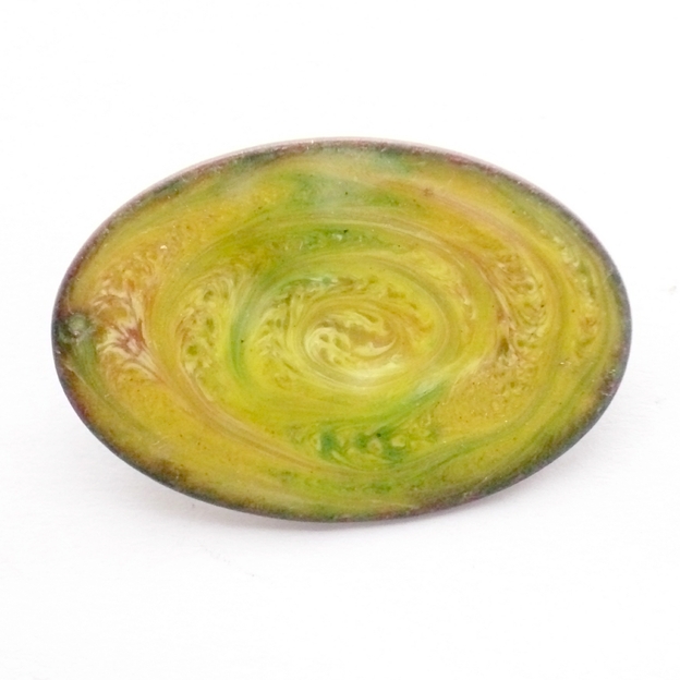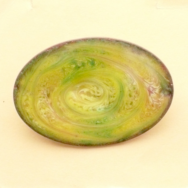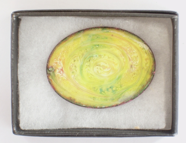 I have made this brooch by drawing through the red hot enamel in a counterclockwise direction to generate the patterns in the white, pink and green enamel that I had laid over the yellow base coat.