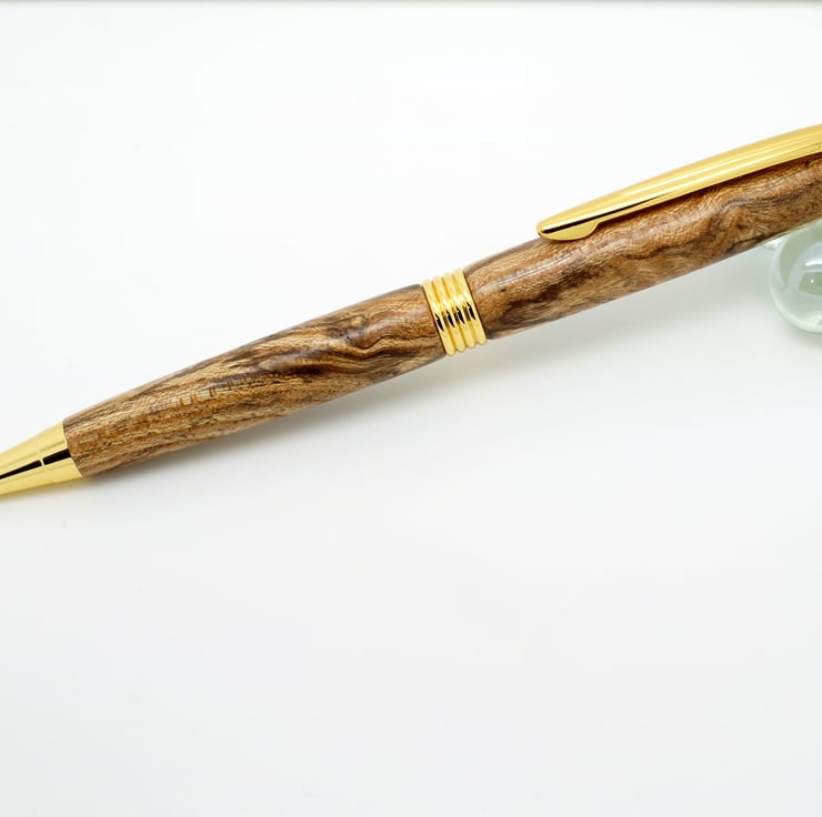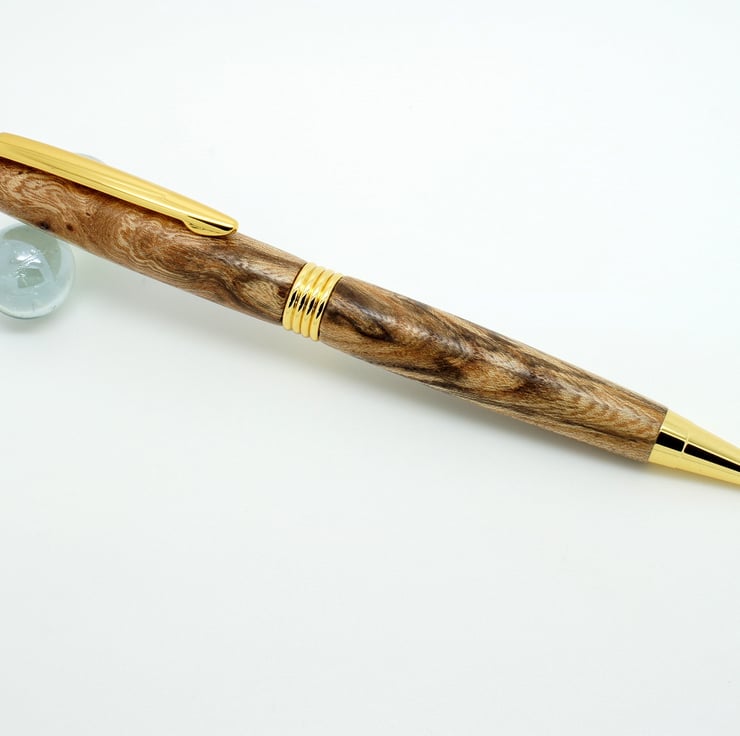 This pen was handturned by me in my workshop in suffolk, the metal parts are gold finish, Included in the price is a black card presentation box & Protective velvet sleeve