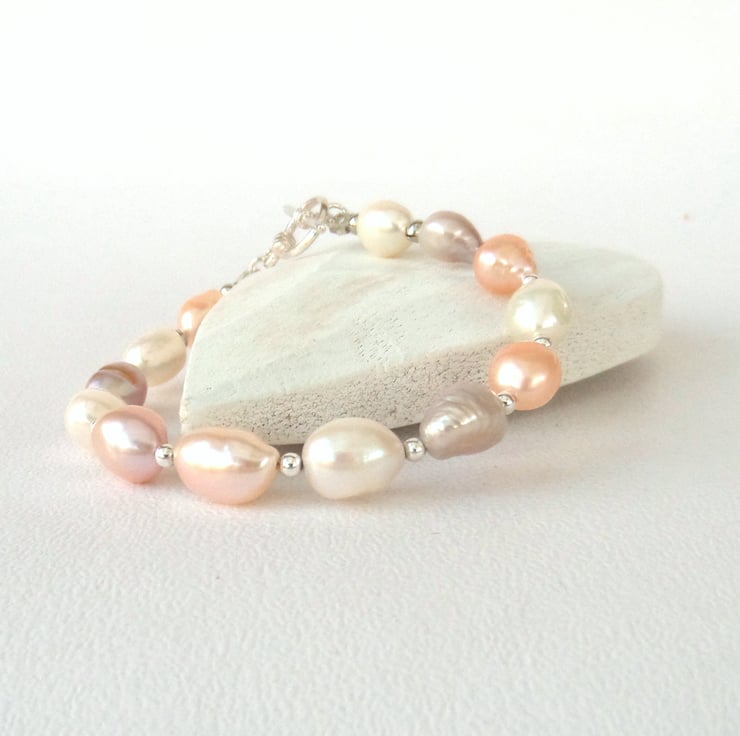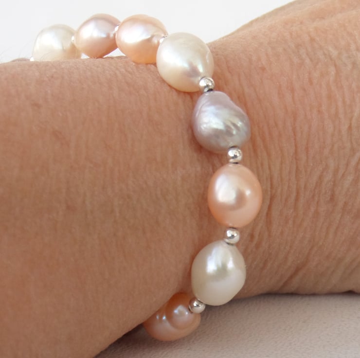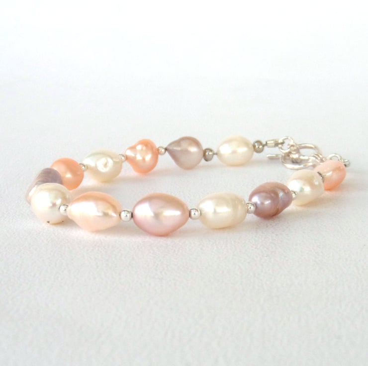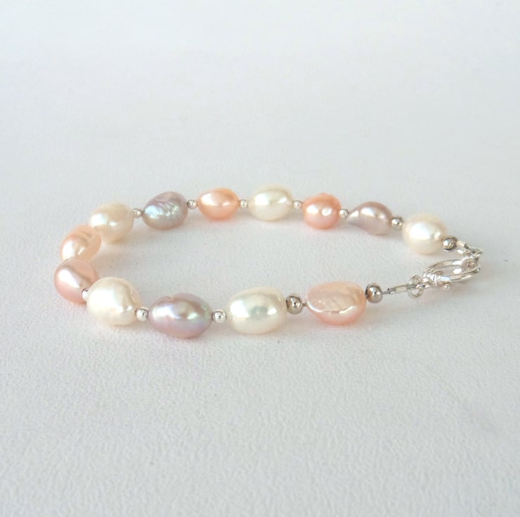 A pretty pearl bracelet, with ivory, peach and lavender rice pearls.