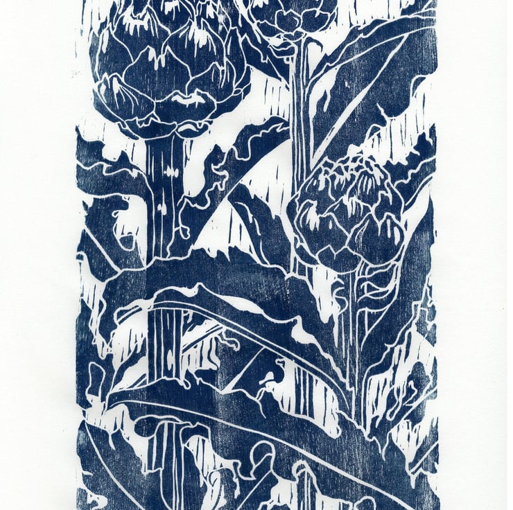 Carved on an oak block and printed to accentuate the grain in the final print.