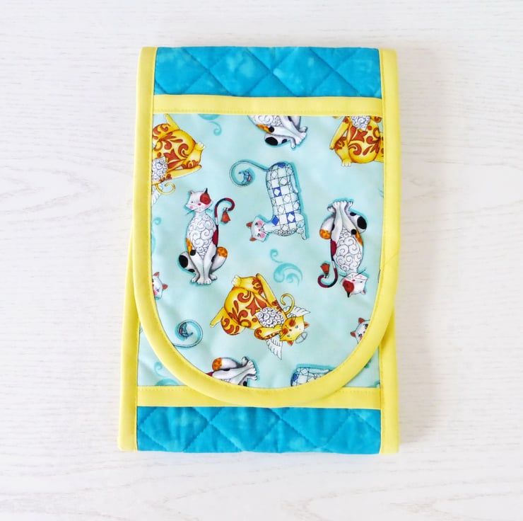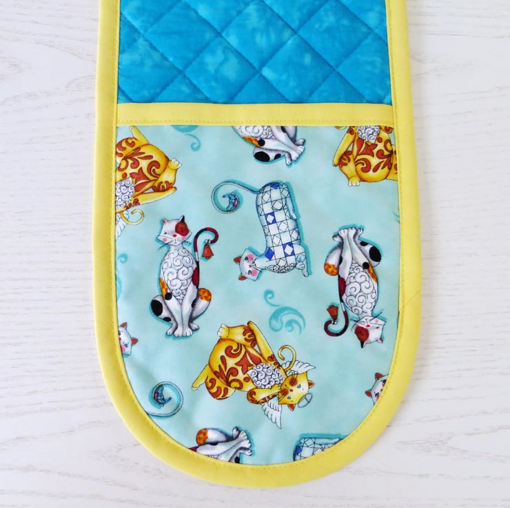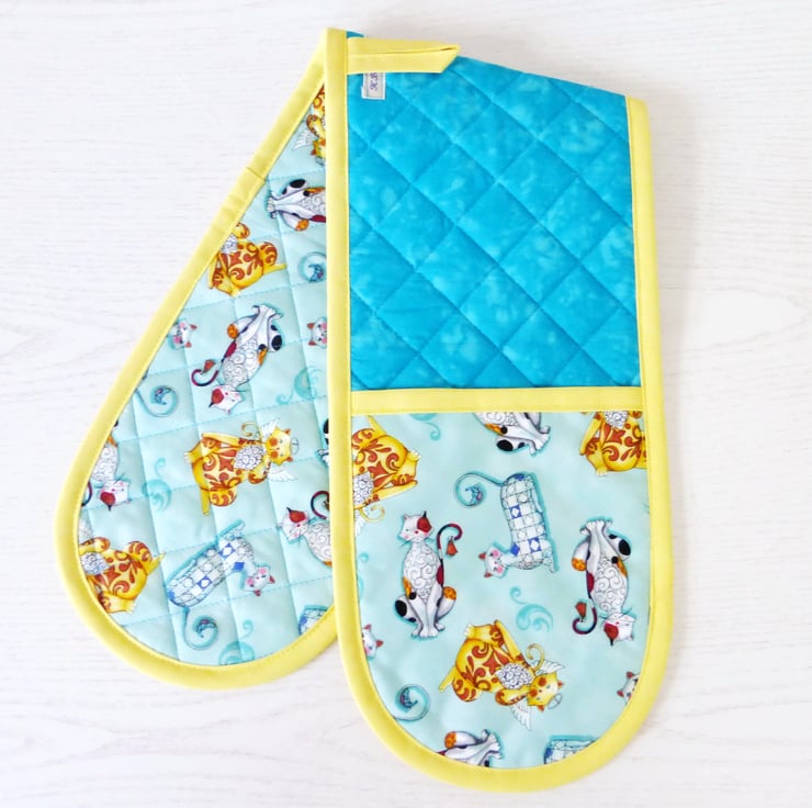 These oven gloves have been made using a lovely quilting cotton fabric, with a cat design, and a contrast turquoise marble effect cotton fabric. There is a layer of insulating wadding(containing polyester), and a layer of cotton wadding inside, and the gloves have then been quilted.