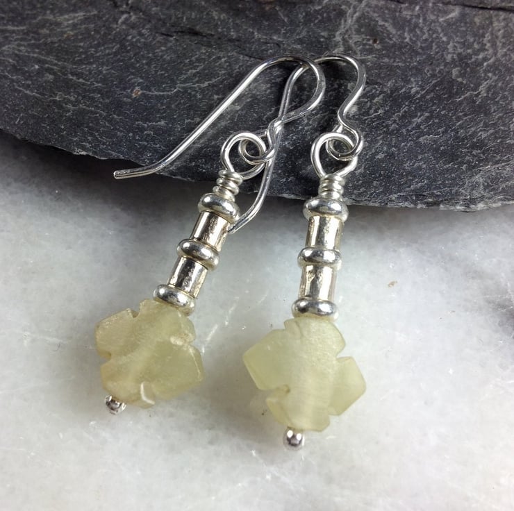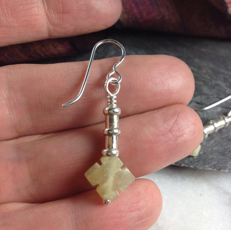 Pale celadon green serpentine has been carved into attractive shapes, I have topped them with my handmade solid silver beads, adding a nice weight and swing.