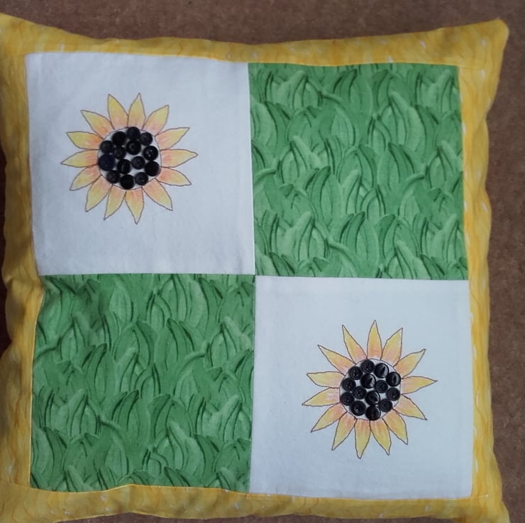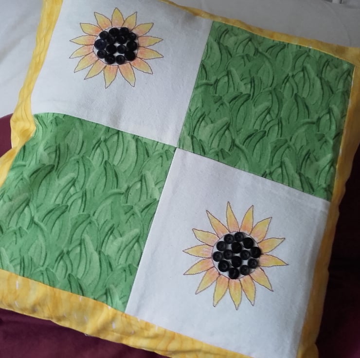 A cushion made with two machine sewn sunflowers that have been coloured using fabric dye crayons with buttons as seeds.