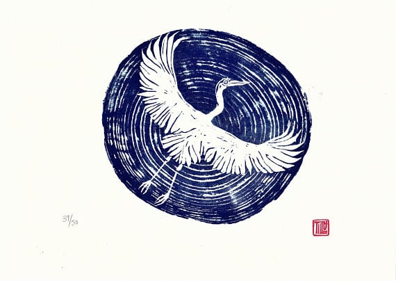 The woodblock is made from ash wood, cut across the end grain to show the rings of the tree. I have used these to symbolise water and make it seem as if you are looking down at the heron from above flying over a pond.
