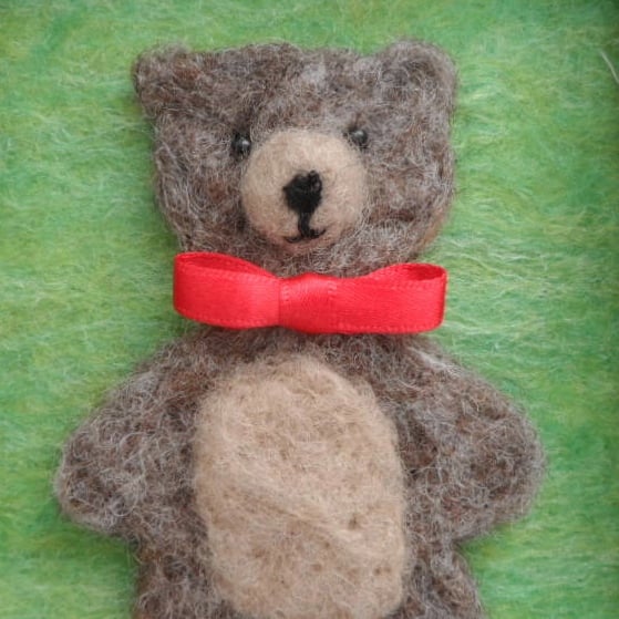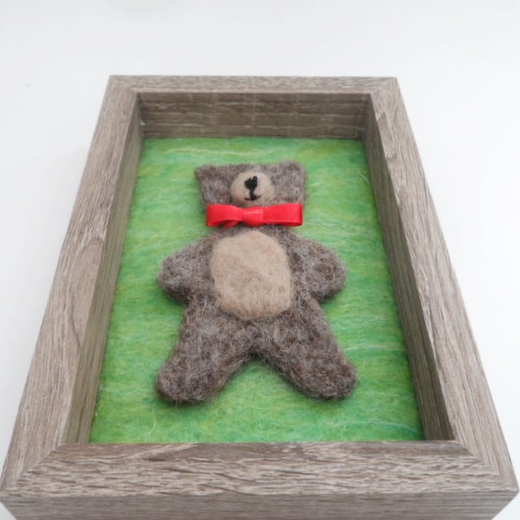 This listing is for an adorable needle felted teddy picture to hang on the nursery wall. The main body of the teddy has been needle felted using a natural brown perendale wool and then a 3D snout and slightly rounded tummy has been added using a beige coloured wool. Small black bead eyes have been added along with a needle felted black nose and stitched mouth. A red ribbon forms a bow around his neck. The teddy has then been mounted on a green felt background, that has been hand felted using a blend of green merino wool and bleached tussah silk fibres, and framed in a 6" x 4" deep wood effect frame (approx 1" deep). The frame has no glass and has a hanging loop on the reverse.