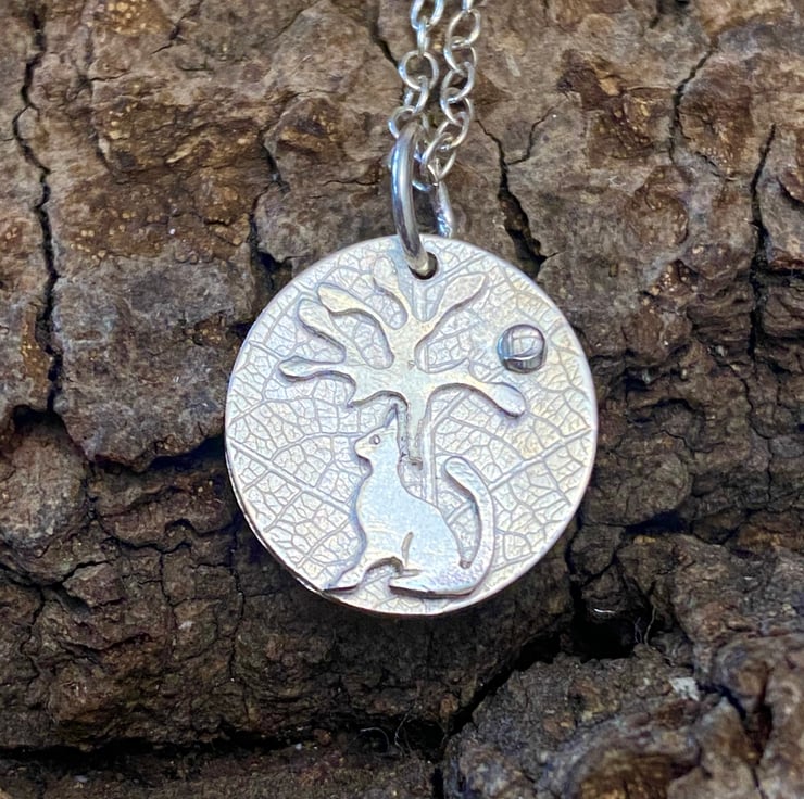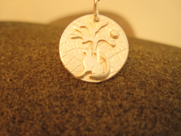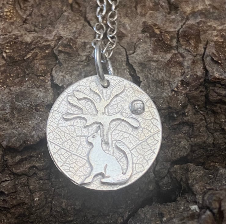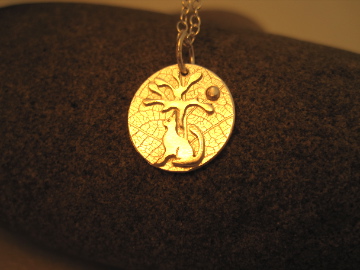 A bonny little cat, sitting under a tree with the sun in the distance. A necklace to remind us of the days when it's warm enough to sit outside and watch the clouds drift by.....