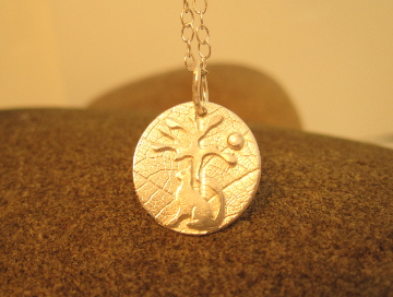 Polished leaf imprinted finish with silver cate, tree & sun detail and polished chain.