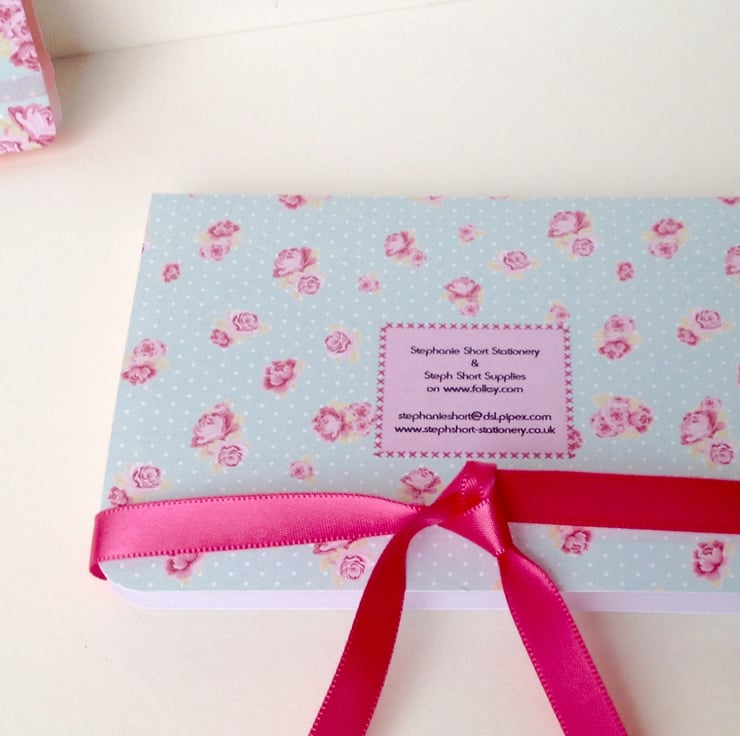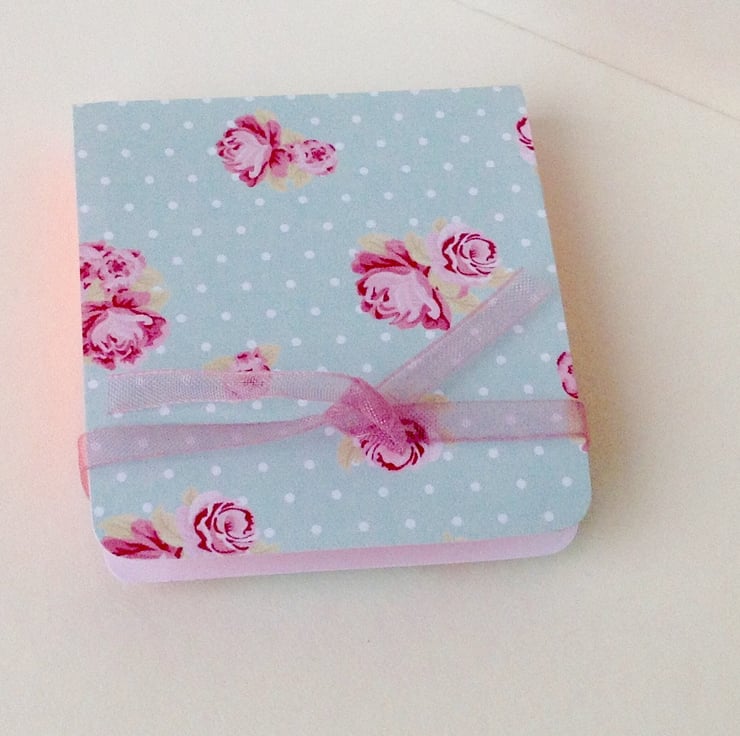 They are made from a vintage rose and polka dot printed card in a pastel green and pinks shade. They are fastened at the back of the pads with a matching ribbon and finished with buttons and embellishments.