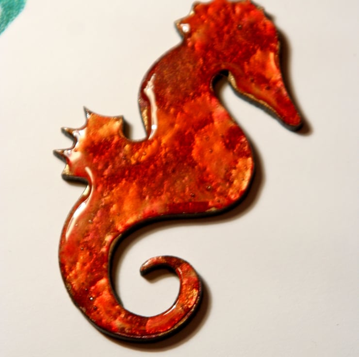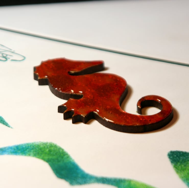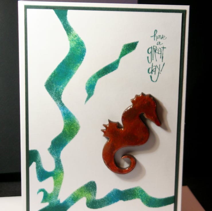 Handcoloured through a handcut stencil the seaweed flows around a beautiful seahorse. The seahorse on this handcrafted card is 4mm thick MDF that has been coloured with metallic shimmer heat embossed powders. and then glazed with a high gloss finish to enhance the colours.