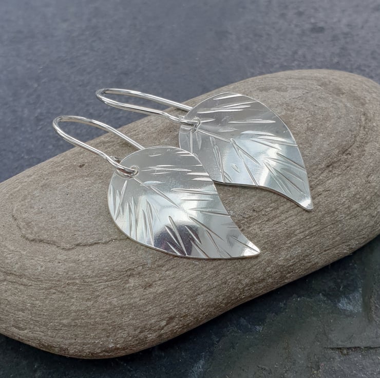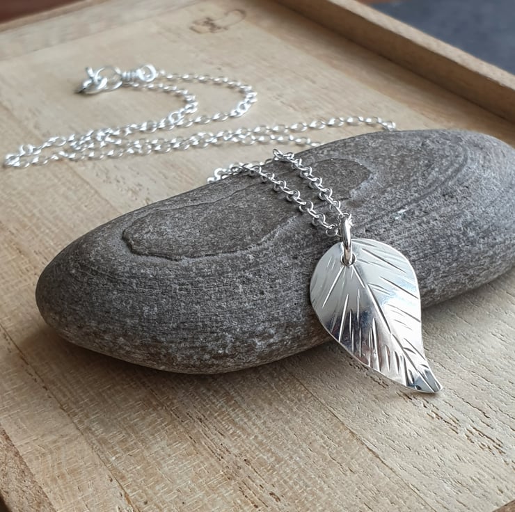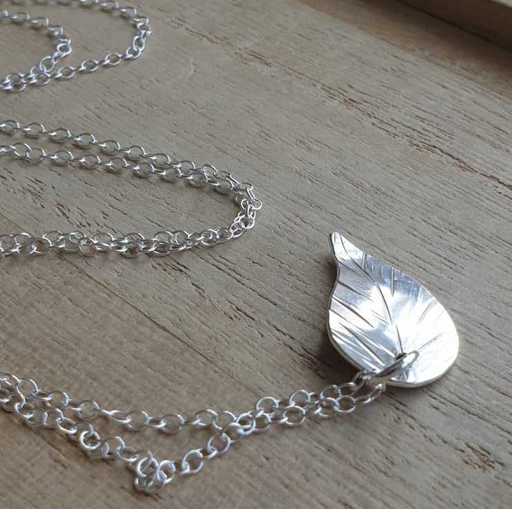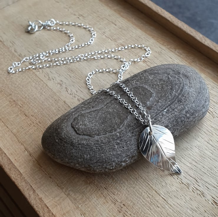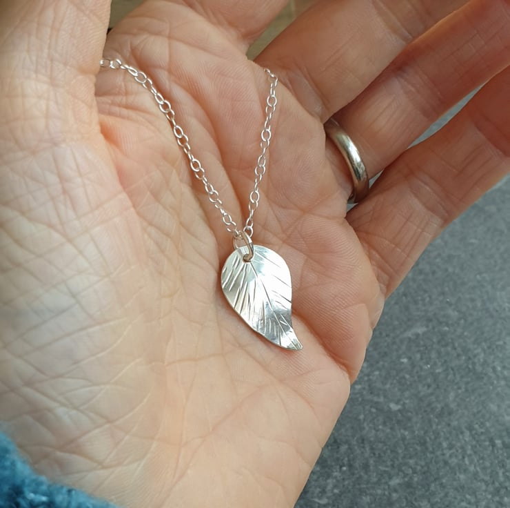 A dainty hand cut and textured silver leaf pendant suspended from a fine sterling silver chain. It's been polished to a shiny finish and looks lovely worn as an everyday necklace - it's simple style means it goes well with everything.
