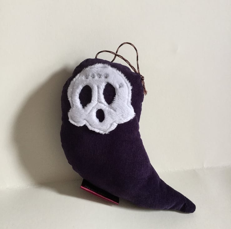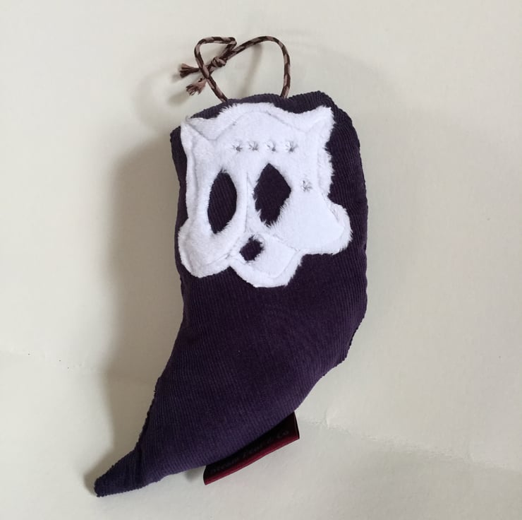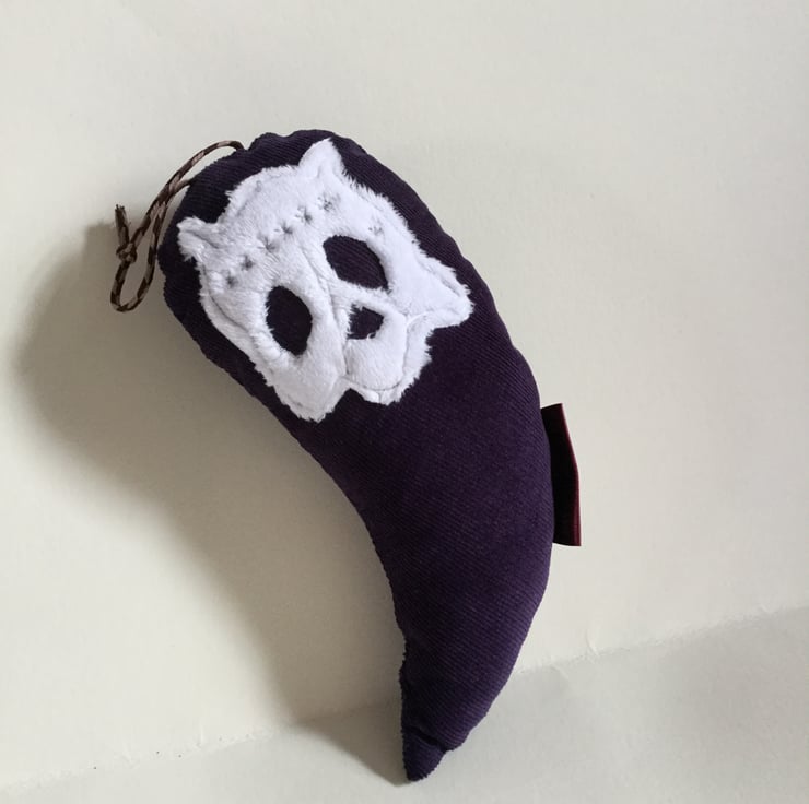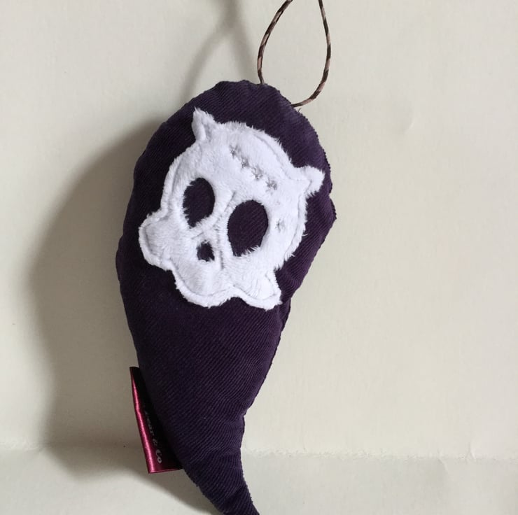 27cm top to bottom. Handmade soft purple corduroy body with white plush Skull. Has silver decorative stitching on the skull.