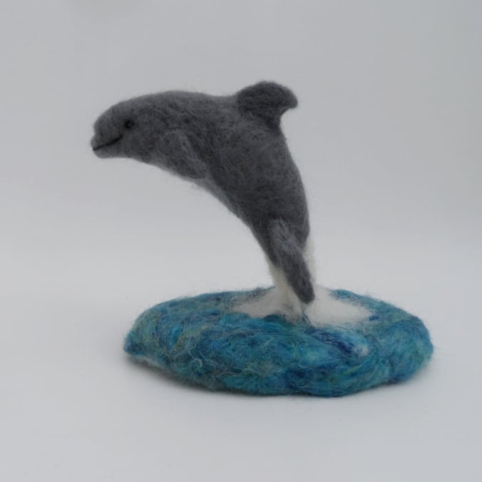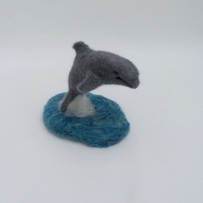 This adorable leaping dolphin has been needle felted using grey merino wool over a core wool base and has had black glass eyes inserted. Mounted on a blue-green "sea" base, this dolphin represents many hours of needling to create a solid, sculptured object. The base measures approximately 9cm x 15cm (3.5" x 6") and the ornament is 13cm (5") high at the highest point.