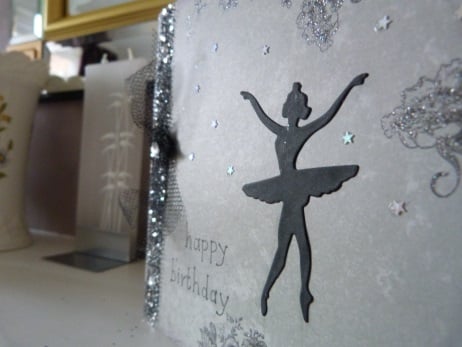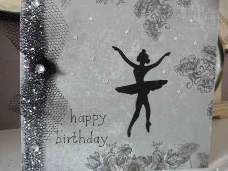 A completely handmade and unique card. Consisting of a ballet dancer die cut from black card and mounted onto a moody pale green glitter card which has then been mounted onto quality pristine white card. Decorated with a ribbon and bow made from black net which has been filled with silver glitter and three clear rhinestones. Finished off with a scattering of tiny holograph stars and a hand written happy birthday in black ink