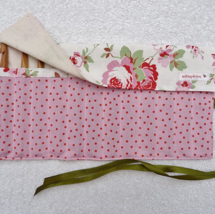 I have used a 100% cotton fabric to create this fantastic crochet hook case. It is sewn from a lovely roses print fabric with a plain cream and pink polka dot cotton lining and has a green ribbon tie.