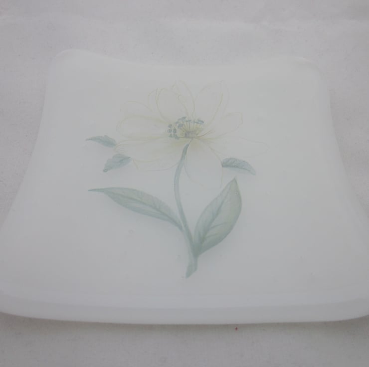 This glass trinket bowl was fused by me in my studio. The glass was heated up to around 800 degrees celsius in a small glass fusing kiln. It was then brought to annealing temperature to make it strong. Any sharp edges were then smoothed by my grinder and the glass returned to the kiln for further firing. It was then slumped to create a bowl shape. This whole process takes over 22 hours to complete.