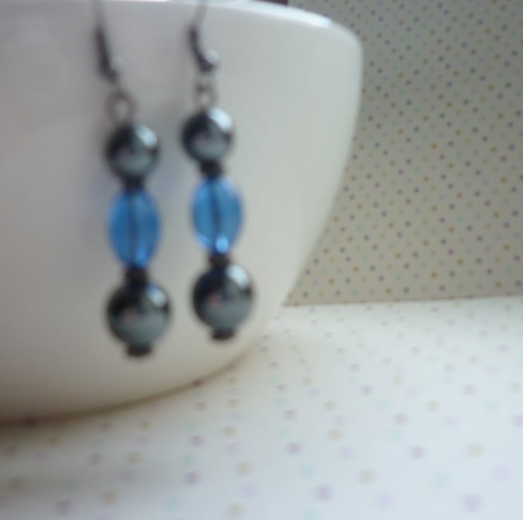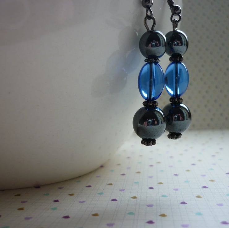 THE EARRINGS HAVE BEEN MADE USING 10MM ROUND HEMETITE STONE BEADS, OVAL GLASS BEADS IN SAPPHIRE BLUE ALONG WITH 6MM ROUND HEMETITE STONE BEADS, BLACK DAISY SHAPED SPACER BEADS AND FINISHED WITH BLACK FISH HOOK EAR WIRES.