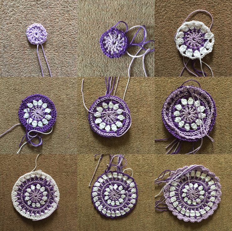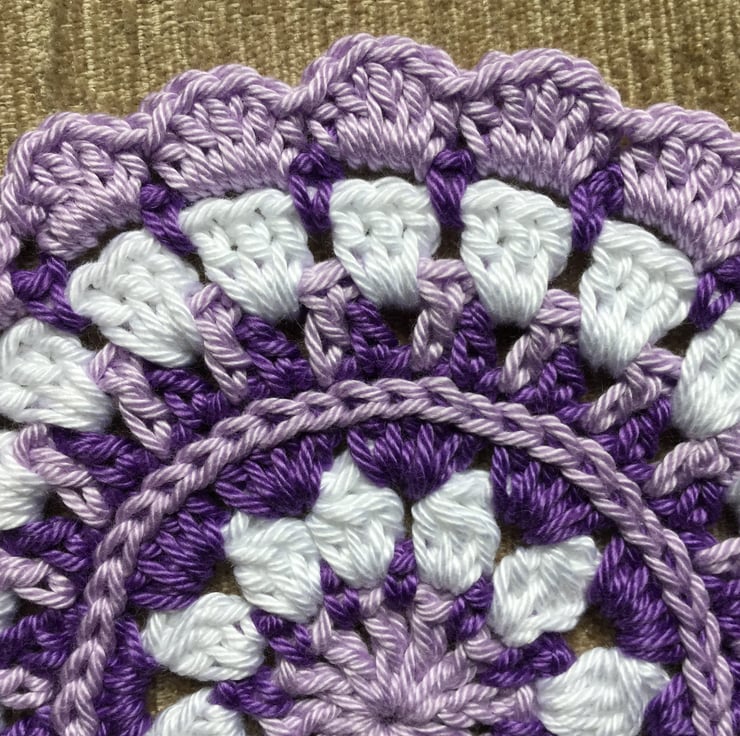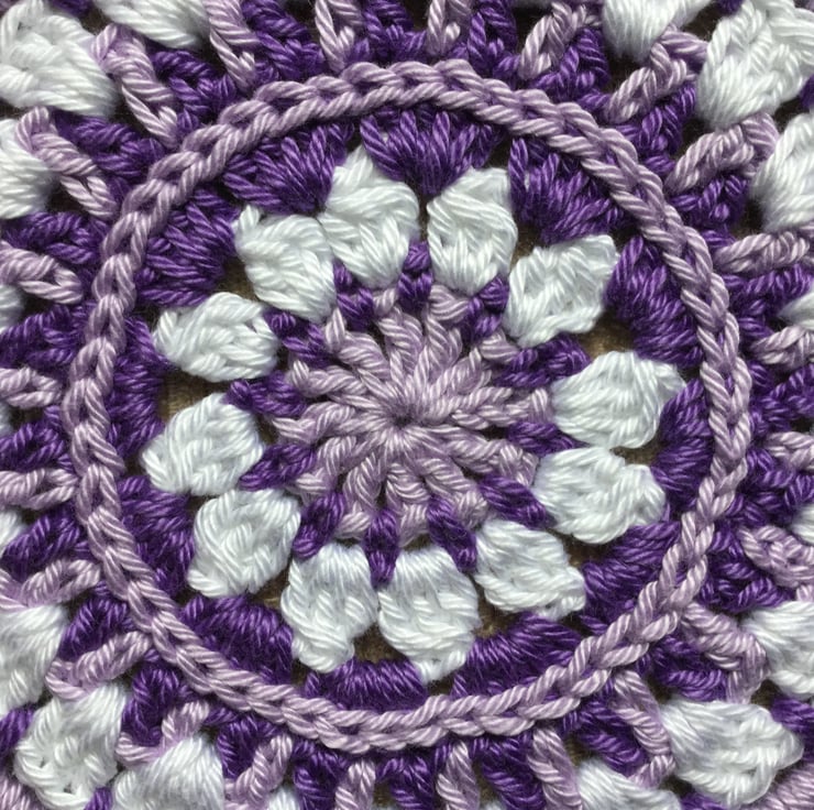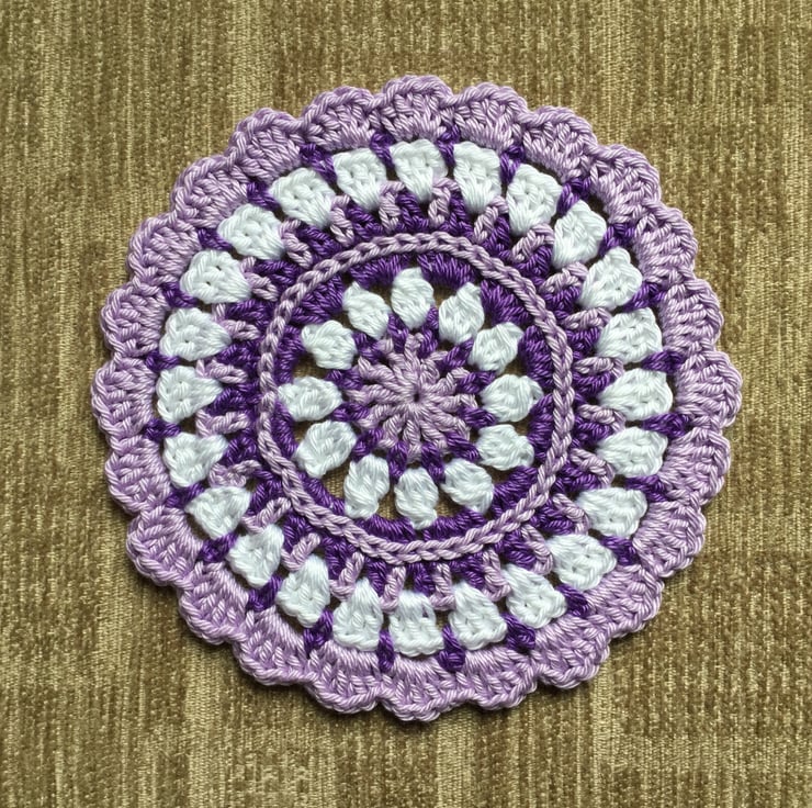I have crocheted this Mandala table mat in a good quality 100% cotton yarn, the finished mat measures approx. 6" (15cm) across.