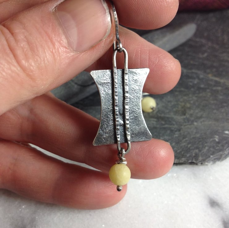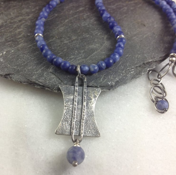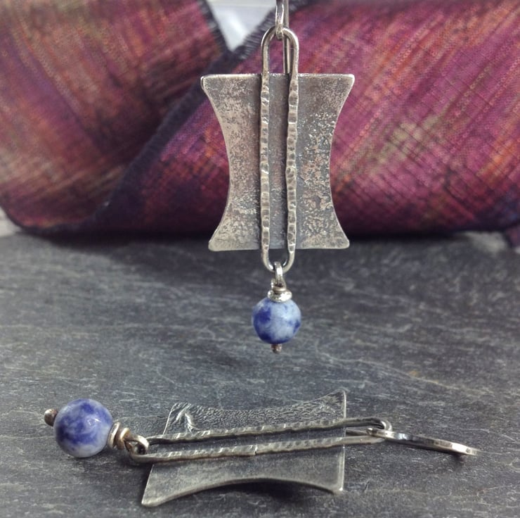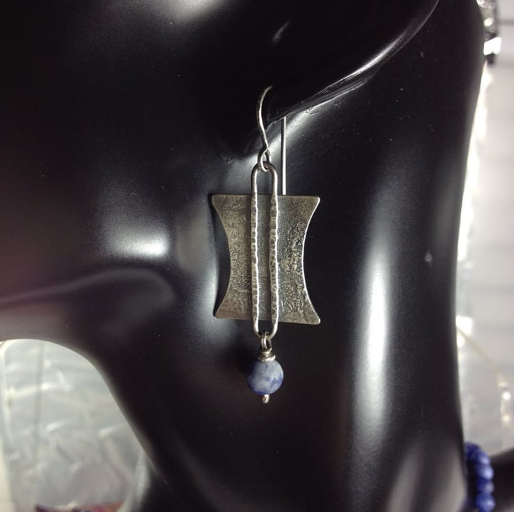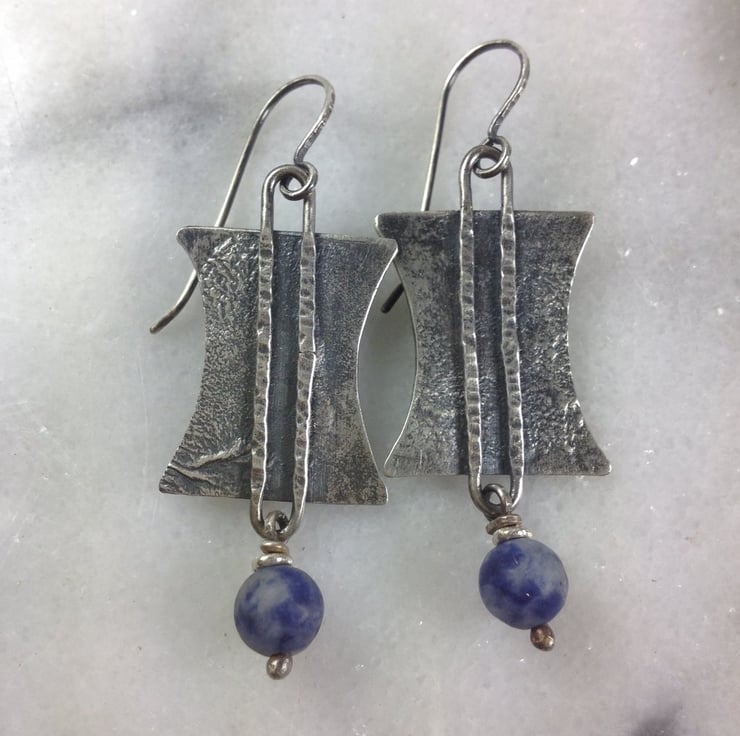 These earrings have been made from heat textured silver , they have been oxidised black and rubbed back for bright highlights. I have added a satin finished denim blue sodalite bead , and hung them from handmade hooks.