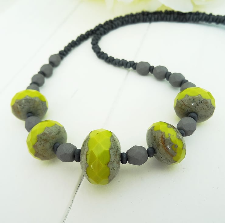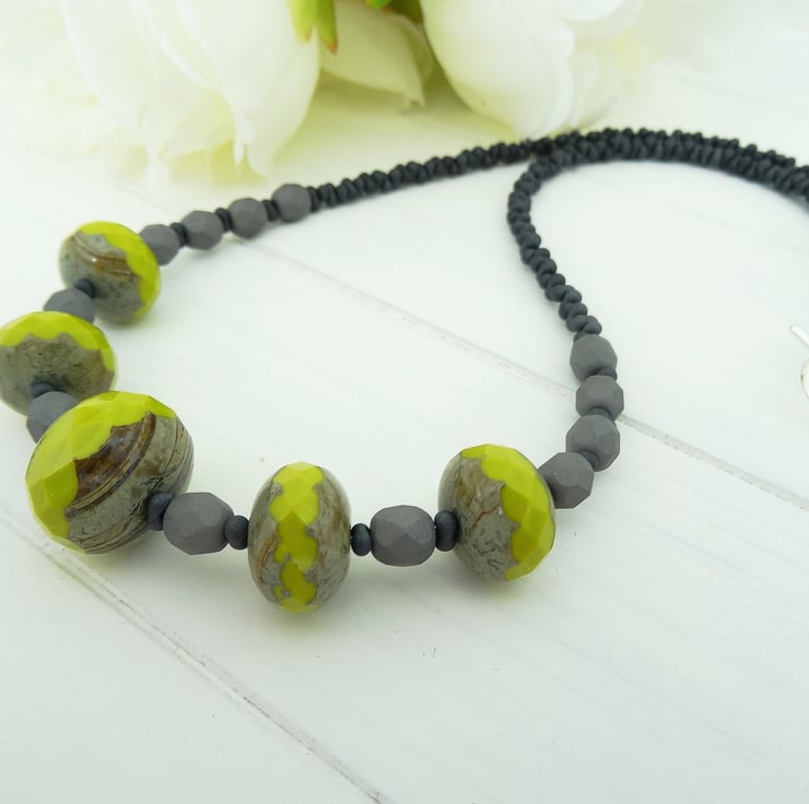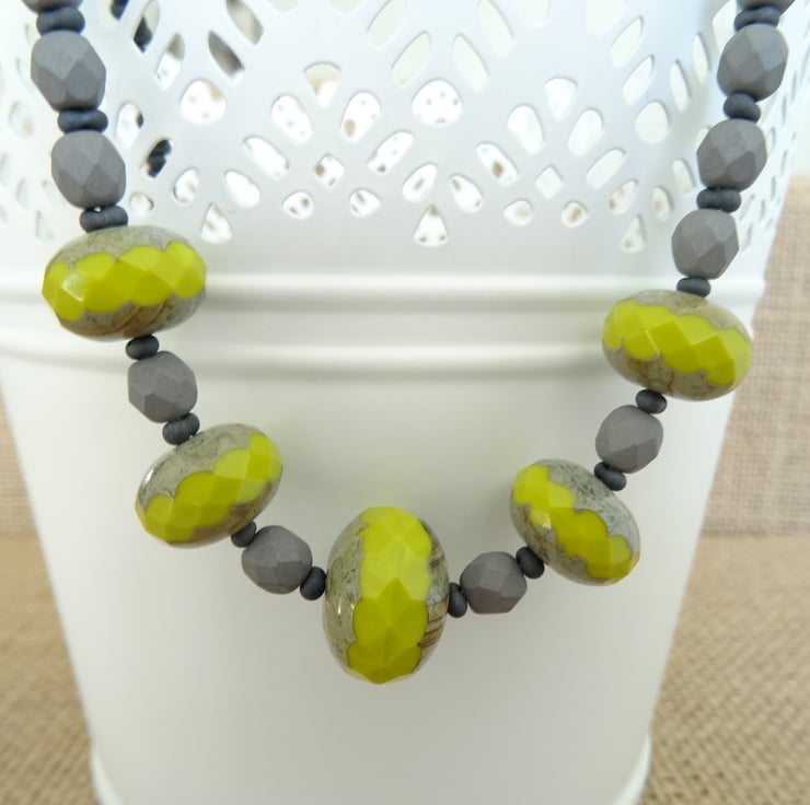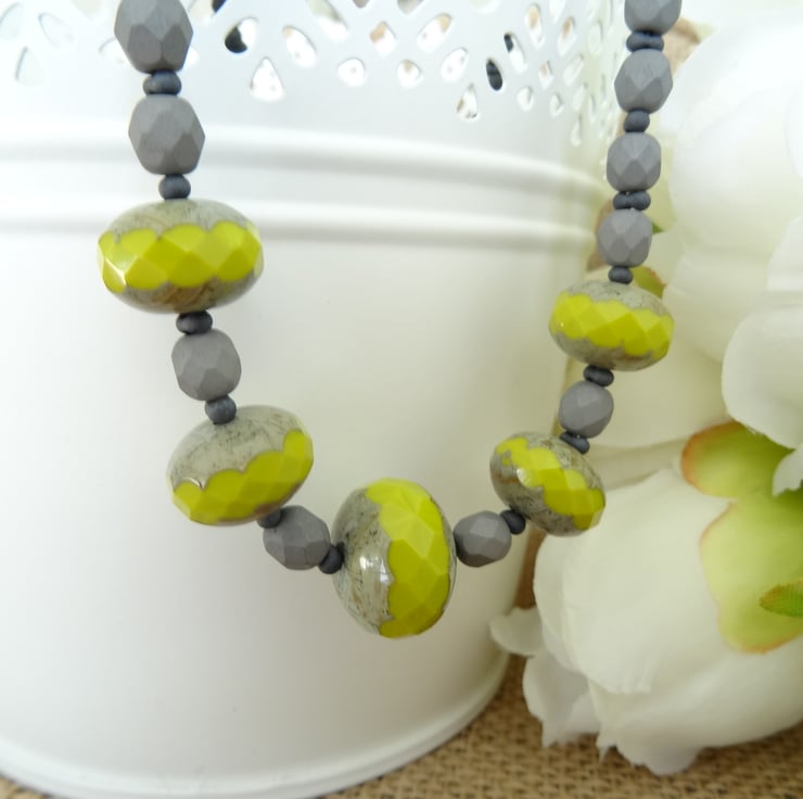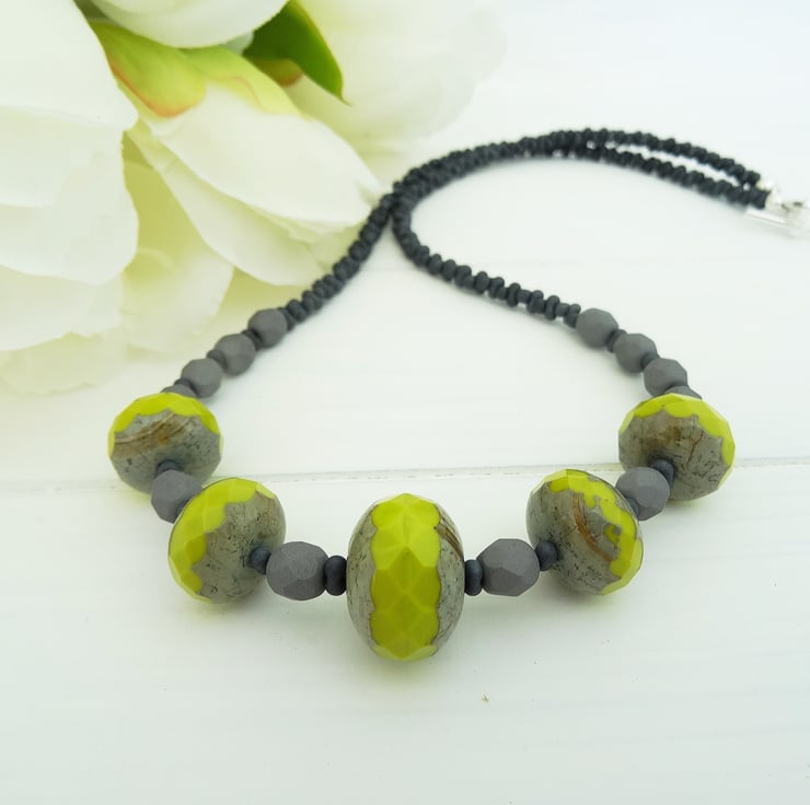 This is a lovely necklace made entirely with high quality czech glass beads including 18mm and 14mm faceted rondells in grey with a central faceted pattern in chartreuse. I have also added matt grey faceted 6mm beads and the upper body of the necklace is matt graphite peanut beads. The necklace measures 19" (48cm) and closes with a silver plated toggle clasp. As all of the items in my shop are unique, individual pieces made by myself, this is the necklace you will receive. It will arrive gift wrapped in tissue paper and a organza bag.